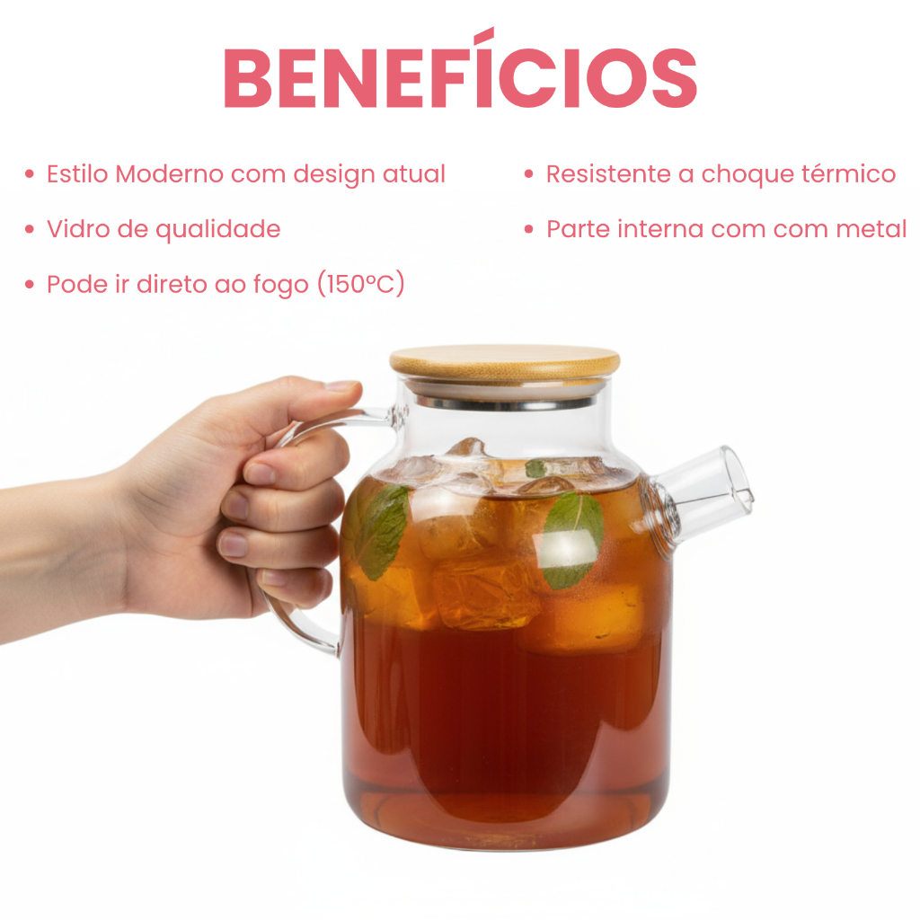 Chaleira de Vidro Borossilicato com Tampa de Bambu – 1,8 Litro A Chaleira de Vidro Borossilicato 1,8 L é a escolha ideal para quem busca beleza, resistência e praticidade na hora de preparar bebidas quentes ou geladas. Com design moderno e acabamento elegante, ela é perfeita para servir chás, cafés e infusões com estilo. ✨ Benefícios: - Vidro de qualidade premium – feita em borossilicato, mais resistente a altas temperaturas e variações térmicas. - Pode ir direto ao fogo (até 150 °C) – ideal para ferver água ou preparar o chá diretamente na chaleira. - Resistente a choque térmico – suporta mudança brusca de temperatura sem trincar. - Tampa de bambu com vedação – mantém o calor e preserva o sabor da bebida. - Design moderno e versátil – combina com qualquer estilo de cozinha ou mesa posta. 📏 Medidas: Altura: 18,5 cm Diâmetro: 8,5 cm Capacidade: 1,8 litro Seja para preparar um delicioso chá quente ou um refrescante chá gelado, essa chaleira é a combinação perfeita de elegância, praticidade e resistência.