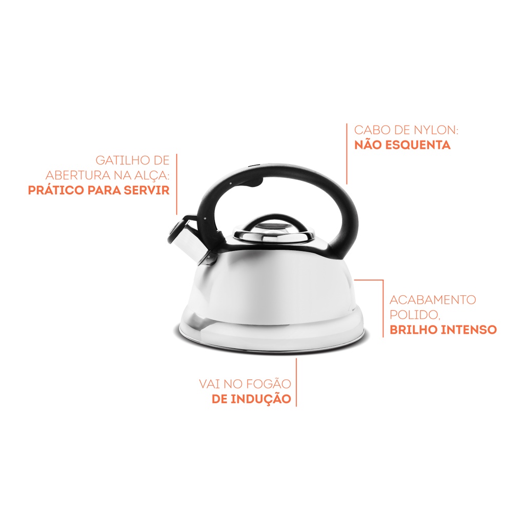 Seja Bem-Vindo(a) à Mimorada! Você não perde tempo e nem esquece a chaleira no fogão, pois ela avisa quando a água ferver. Aproveite todo o tempo em outras atividades com a Chaleira 2,7L com apito Roma em aço inox - Brinox . A Chaleira 2,7L com apito Roma Brinox foi projetada para muitos tipos de fogões como fogão a gás, vitrocerâmico, elétrico e inclusive por indução. Além da 2,7L conheça também as demais chaleiras integrantes da linha Roma, produtos importados com a garantia de qualidade do Grupo Brinox. A linha de Chaleiras Roma é feita toda em aço inox, com acabamento externo polido, garantindo a durabilidade do produto. A alça é bastante segura pois é confeccionada em nylon e possui um gatilho para abertura. A Chaleira possui capacidade para 2,7L e tem dimensões de 24,5 x 22,5 x 20,5 e pesa pouco mais de 500g. Seja para aquecer água para passar café ou para o chá da tarde a Chaleira 2,7L em aço inox Roma Brinox é a solução segura e confortável para o seu dia a dia. E para manter seus produtos de aço inox sempre brilhando, lave-os com esponja macia, água corrente e sabão ou detergente neutro. Evite produtos abrasivos como palha de aço e outros, pois eles podem riscar ou prejudicar o brilho da sua Chaleira. Para evitar manchas, enxague bem após lavar e seque em seguida para evitar manchas. Conheça também os demais produtos das marcas Brinox, Coza e Haus Concept para deixar a sua casa ainda mais bonita com soluções completas de organização. O Grupo Brinox, com desenvolvimento e produção no Brasil, é um dos maiores fabricantes de utilidades domésticas do Brasil. Localizado na cidade de Caxias do Sul, na Serra Gaúcha e expandindo permanentemente a sua atuação no mercado externo, o Grupo Brinox possui canais de exportação nos cinco continentes e atua ativamente em mais de vinte países. Através de suas marcas, Brinox, Coza e Haus Concept, oferece um mix de mais de 6 mil itens, e segue com seus planos de expansão como um grande participante no mercado de utilidades domésticas. Certificação compulsória certificada pelo OCP 0003, registro 003702/2020, conforme Portaria Inmetro 499/2021.