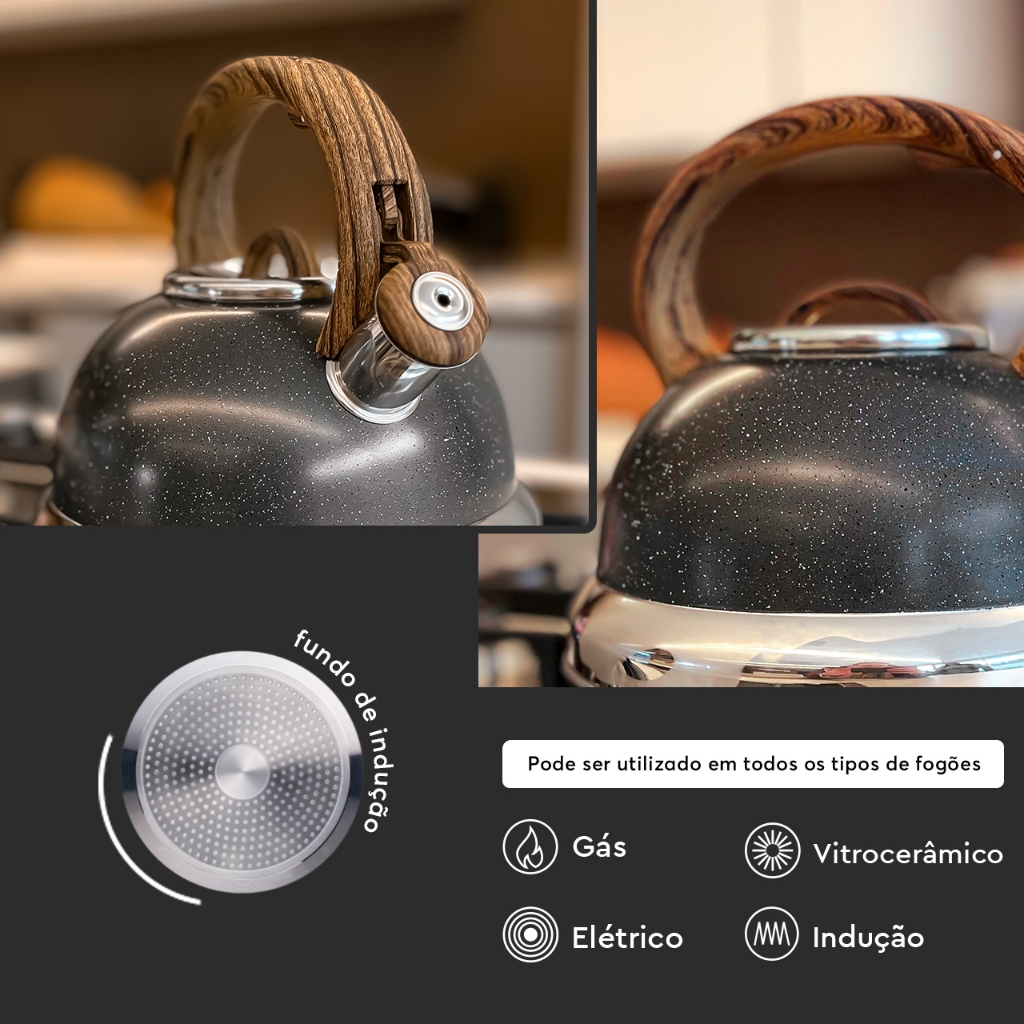 Seja Bem-Vindo(a) à Mimorada! A Chaleira Roma é compatível com todos os tipos de fogões, desde o convencional à gás, elétricos e de indução. A Chaleira Brinox com Fundo de Indução da Linha Roma Granito é um item que, além de atemporal, é a união perfeita entre design sofisticado e qualidade excepcional. Fabricada em aço inox com um fundo de indução, esta chaleira não apenas proporciona durabilidade e resistência, mas também garante aquecimento rápido e uniforme em qualquer tipo de fogão, inclusive os de indução. Com uma capacidade generosa de 2,7 litros, a Chaleira Roma Granito é ideal para quem aprecia a praticidade de ter água fervida pronta rapidamente. Seu revestimento externo siliconado, na exclusiva cor Granito, confere um visual moderno e estiloso à cozinha. Destacando-se ainda mais pelo detalhe da alça em nylon com acabamento soft touch amadeirado escuro, esta chaleira oferece conforto ergonômico ao ser manuseada, garantindo segurança e estabilidade durante o uso. O cabo antitérmico permite que a chaleira seja utilizada com conforto, mesmo com a presença de água quente. Também possui, ainda no cabo, a presença do gatilho que garante comodidade e segurança na hora de servir. Além de sua funcionalidade prática, a Chaleira Roma Granito foi projetada para integrar perfeitamente com outros itens da mesma coleção, todos na distinta cor Granito, proporcionando uma cozinha harmoniosa e estilosa. Seu apito inteligente avisa com precisão quando a água atinge o ponto de ebulição, tornando-a não apenas uma peça de beleza estética, mas também uma aliada na rotina diária da cozinha. *Com dimensões de 24,5 x 22,5 x 20,5cm, esta chaleira não ocupa muito espaço no balcão ou na prateleira, facilitando seu armazenamento quando não estiver em uso. Versátil e robusta, a Chaleira Roma Granito é uma escolha ideal para quem busca qualidade, design contemporâneo e funcionalidade superior em um único produto.