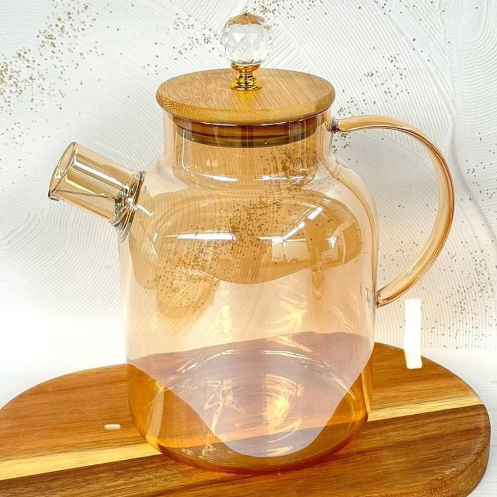 Chaleira de Vidro liso ambar com Tampa Bambu cristal Premium Borossilicato 1,8L Bule chá café