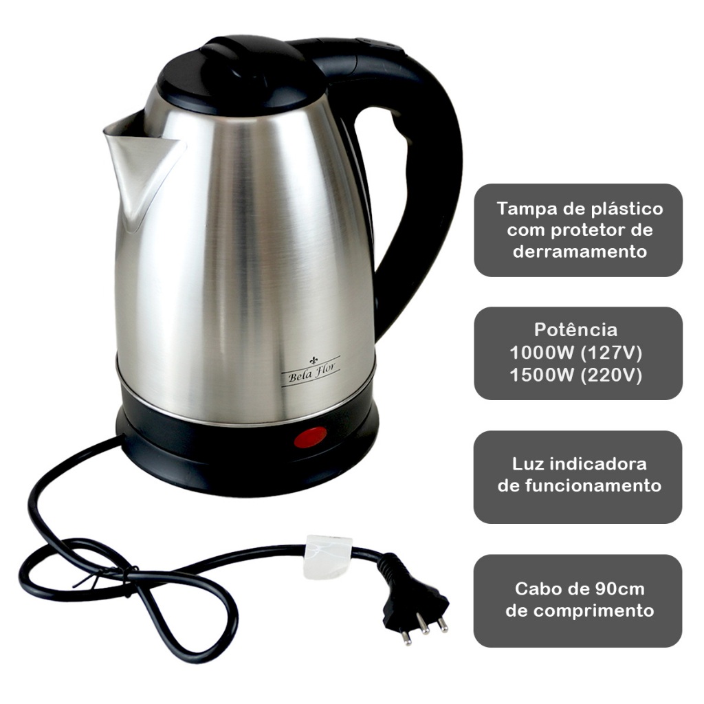 Chaleira Elétrica 1,8L Premium – Bela Flor Praticidade, eficiência e design sofisticado definem a Chaleira Elétrica Premium da Bela Flor. Com capacidade de 1,8 litros, ela é ideal para ferver água de forma rápida e segura, seja para preparar cafés, chás, chimarrão ou receitas que exigem água quente. Seu corpo em aço inoxidável une durabilidade e elegância, tornando-a uma peça funcional e moderna para qualquer cozinha. Equipada com tecnologia de segurança e alto desempenho, a chaleira conta com duplo controle de temperatura dourado, que garante precisão no aquecimento, além de desligamento automático após a fervura, oferecendo tranquilidade ao usuário. A luz indicadora sinaliza o funcionamento, enquanto a base de aquecimento separada com porta-fio proporciona praticidade no uso e armazenamento. Outro diferencial é sua usabilidade inteligente. A chaleira possui giro de 360° sobre a base, permitindo manuseio fácil em qualquer direção. A tampa com protetor de derramamento evita acidentes e respingos, tornando o uso ainda mais seguro. Compacta, potente e elegante, é a escolha certa para quem busca eficiência e estilo na rotina diária. Especificações Marca: Bela Flor Modelo: Premium Capacidade: 1,8 litros Potência: 1000W (127V) / 1500W (220V) Frequência: 60Hz Corpo: Aço inoxidável 0,26 mm Chassi de aquecimento: Aço inoxidável, 0,3 mm Tampa: Plástico com protetor de derramamento Duplo controle de temperatura dourado Luz indicadora de funcionamento Desligamento automático após a fervura Base de aquecimento separada com porta-fio Giro 360° sobre a base Cabo de 90 cm