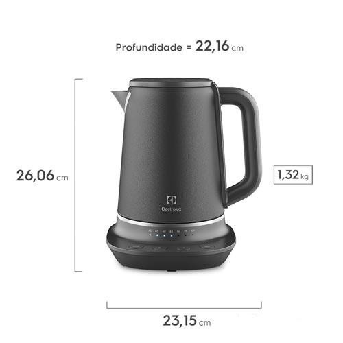 Capacidade de 1,7 litros, desligamento automático e trava na tampaDestaques Tecnologia PerfectSense Ideal para atingir a temperatura exata dos mais diversos preparos. Varia o controle de temperatura entre 40°C a 100°C. Função Manter Aquecido Conserva a temperatura por até 40 minutos. Após acionada, é ativada ao longo deste período sempre que o calor da água diminui 2°C. Ótima Capacidade 1,7L para você aquecer a quantidade ideal de água para diversas receitas. Design Premium Projetada em aço inox, o acabamento é texturizado e oferece alto padrão de elegância. Indicador Transparente do Nível da Água Visualize facilmente a quantia colocada para preparo. Tampa Pop-Up Segura para o dia a dia, a chaleira só abre caso este sistema seja acionado. Base 360° Posicione a jarra na base de aquecimento em qualquer ângulo, com facilidade. Sistemas de Segurança Integrados A chaleira desliga automaticamente caso não haja água suficiente no reservatório. Desligamento Automático O produto emite aviso sonoro e desliga automaticamente ao atingir a temperatura de aquecimento desejada. Facilidade de Transporte Corpo da chaleira livre de fios. Alça Ergonômica Oferece máximo conforto no manuseio. Enrolador de Cabo A base de aquecimento possui enrolador de fios para manter sua cozinha organizada quando o produto não está em uso. Características Capacidade: 1,7 Litros Desligamento Automático Trava na Tampa Especificações Técnicas Modelo: EKP70 Cor: Black Pearl Material: Aço Inoxidável Potência: 1250W (110V) / 2000W (220V) Consumo: 1,25kW/h (110V) / 2,0kW/h (110V) EAN: 7896347164603 (110V) / 7896347164627 (220V) Garantia: 12 meses Dimensões e Peso Dimensões do Produto sem Embalagem (AxLxP): 261x222x232 mm Dimensões do Produto com Embalagem (AxLxP): 250x262x222 mm Peso do Produto sem Embalagem: 1,32 Kg Peso do Produto com Embalagem: 1,58 Kg Itens Inclusos 01 Chaleira Manual