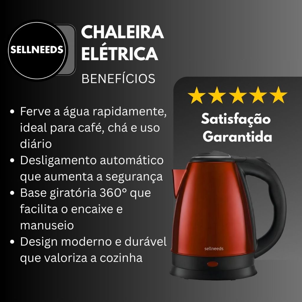 🔥 Chaleira Elétrica 2L Vermelha – Estilo, Agilidade e Segurança na Sua Cozinha! Quer praticidade no seu dia a dia? Com a Chaleira Elétrica 1.8 Litros, você prepara café, chá, chimarrão, sopas e muito mais de forma rápida, segura e com muito estilo! Com potência de 1200W, sistema de desligamento automático e design moderno, ela é perfeita para quem valoriza conforto, eficiência e personalidade na cozinha. A cor vermelha vibrante ainda dá um toque especial à decoração! ✅ Destaques do Produto: • Ferve até 1.8L de água rapidamente • Design compacto e moderno com acabamento brilhoso • Base giratória 360° para mais praticidade • Desligamento automático ao ferver: mais segurança • Resistência embutida: mais fácil de limpar e mais durável • Filtro contra impurezas na saída de água • Ideal para café, chá, chimarrão, sopas instantâneas e muito mais 🎨 Visual que se destaca: A cor vermelha vibrante traz personalidade e sofisticação para qualquer ambiente! 🛠️ Ficha Técnica: • Marca: SellNeeds • Modelo: Chaleira Elétrica Vermelha • Capacidade: 1.8 litros • Potência: 1200W • Voltagem: 127V • Material: Plástico resistente com acabamento brilhoso • Base giratória: 360° • Sistema de segurança: Desligamento automático • Filtro de impurezas: Sim • Resistência: Embutida • Dimensões (A x L x P): 23 x 20 x 16 cm (aprox.) • Peso: 0,85 kg (aprox.) 📦 Conteúdo da Embalagem: 1x Chaleira Elétrica Vermelha 1x Base com cabo de energia 1x Manual de instruções