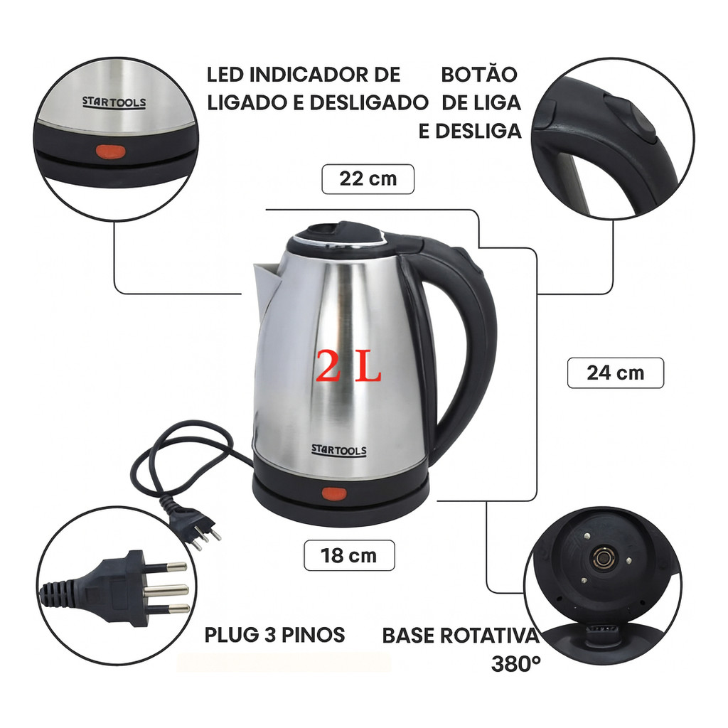 ☕⚡ Chaleira Elétrica Inox 2 Litros – 220V | 1000W Mais praticidade, eficiência e segurança para o seu dia a dia! A Chaleira Elétrica Inox 2 Litros é ideal para aquecer água de forma rápida e segura, perfeita para preparar chás, cafés, sopas instantâneas, macarrão rápido e muito mais. Com potência de 1000W, ela ferve a água em poucos minutos, facilitando sua rotina em casa ou no escritório. Seu design moderno em aço inox garante durabilidade, resistência e um visual elegante que combina com qualquer ambiente. A base giratória 360° sem fio oferece total liberdade de uso, enquanto os sistemas de segurança proporcionam tranquilidade durante o funcionamento. ✅ Destaques do Produto 🔥 Aquecimento rápido – potência de 1000W 💧 Capacidade de 2 litros – ideal para toda a família ✨ Acabamento em inox – resistente, durável e sofisticado 🔄 Base giratória 360° sem fio – mais praticidade no uso 🛡️ Segurança automática – desligamento ao ferver e proteção contra funcionamento a seco 👌 Conforto no uso – alça emborrachada, LED indicador e fundo removível para facilitar a limpeza 📋 Ficha Técnica • Produto: Chaleira Elétrica Inox • Capacidade: 2 litros • Potência: 1000W • Tensão: 220V • Frequência: 60Hz • Dimensões: 22 cm (A) x 19,5 cm (L) • Peso: 586 g • Material: Aço inox + plástico resistente • Cor: Preto e Inox • Grau de proteção: IPX0 • Base: Giratória 360° sem fio • Funções de segurança: Desligamento automático e proteção contra funcionamento a seco 📦 Conteúdo da Embalagem ✔ 01 Chaleira Elétrica Jarra Inox 2 Litros – 220V ✨ Mais rapidez, praticidade e segurança no preparo das suas bebidas! Garanta agora a Chaleira Elétrica Inox 2 Litros e facilite sua rotina ☕⚡