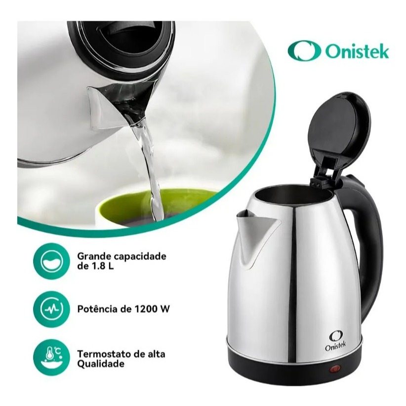A Chaleira Jarra Bule Elétrica Onistek ON-CL200 é a escolha ideal para quem busca eficiência e praticidade na cozinha. Com uma capacidade de 1,8 litros, ela permite preparar grandes quantidades de água quente de forma rápida e segura, ideal para chás, cafés e outras bebidas quentes. Fabricada em aço inoxidável, este modelo não só garante durabilidade, mas também um design elegante que se adapta a qualquer ambiente. Seu sistema de desligamento automático proporciona segurança adicional, evitando superaquecimento e garantindo tranquilidade durante o uso. Com uma potência de 1200W, a chaleira aquece a água de maneira rápida, economizando tempo e energia. A classificação de eficiência energética A+++ assegura que você está fazendo uma escolha consciente e sustentável, contribuindo para a preservação do meio ambiente. Experimente a praticidade e a qualidade da Chaleira Jarra Bule Elétrica Onistek ON-CL200 e transforme sua rotina na cozinha. Ideal para quem valoriza tecnologia e design em um só produto.