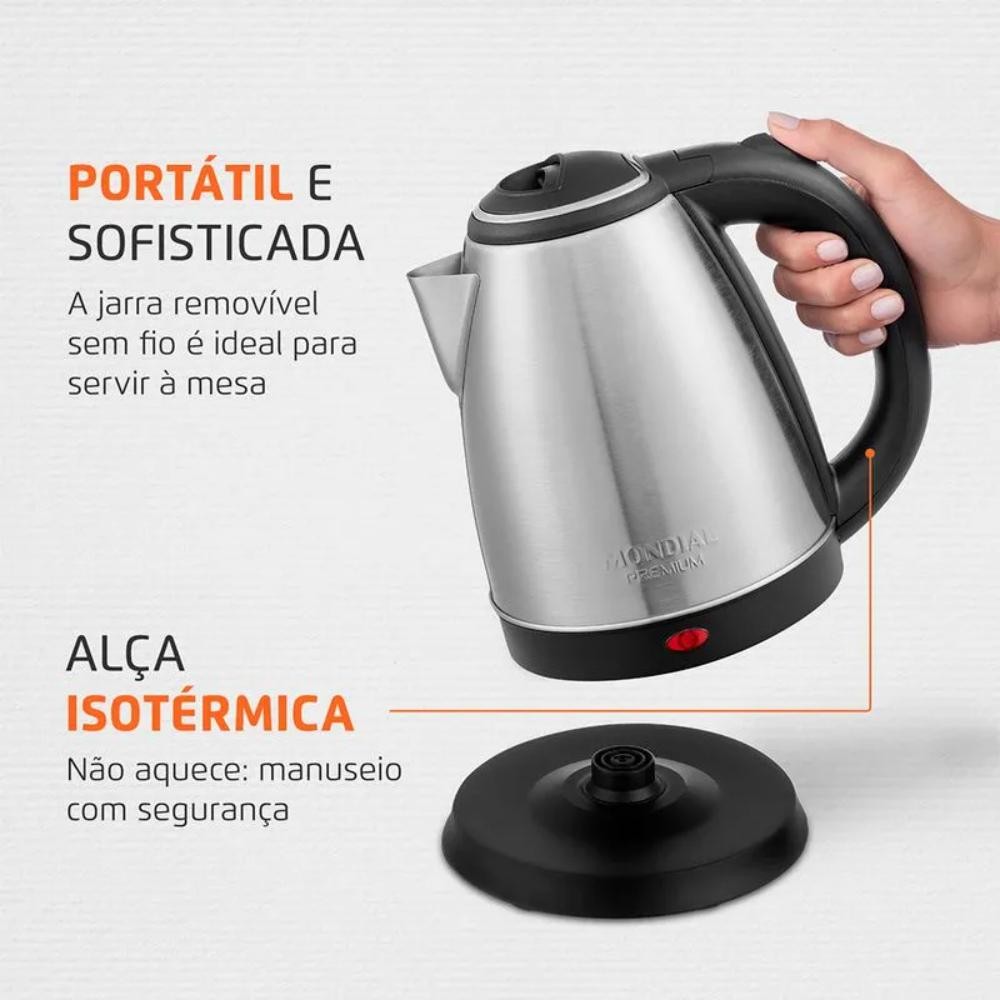 A Chaleira Elétrica Premium Mondial CE-06 é ideal para quem busca praticidade, rapidez e segurança no dia a dia. Com capacidade de 2 litros e acabamento em inox, aquece a água em poucos minutos para você preparar café, chá, chimarrão ou agilizar receitas. Conta com desligamento automático, alça isotérmica, jarra sem fio removível e tampa abre-fácil, garantindo conforto e segurança no manuseio. Além disso, o design sofisticado em aço inox valoriza sua cozinha e deixa a hora do café muito mais elegante. BENEFÍCIOS: 2 litros de capacidade – Ideal para bebidas e receitas. Rápido aquecimento – Água quente em poucos minutos. Desligamento automático – Segurança e economia de energia. Alça isotérmica e ergonômica – Conforto e proteção durante o uso. Jarra sem fio e base 360° – Mais praticidade para servir. Acabamento em inox – Sofisticação e durabilidade. Tampa abre-fácil – Abastecimento simples e seguro. Porta-fio e lâmpada piloto – Organização e fácil visualização do funcionamento. CARACTERÍSTICAS: Marca: Mondial Modelo: CE-06 Capacidade: 2 litros Material: Inox e plástico Potência: 1200W Voltagem: 220V Cor: Preta/Inox Dimensões (A x L x P): 24 cm x 23 cm x 17 cm Peso: 730 g Desligamento Automático: Sim Jarra Removível: Sim Cabo com Porta-fio: Sim CONTEÚDO DA EMBALAGEM: 1 Chaleira Elétrica CE-06 1 Manual de Instruções