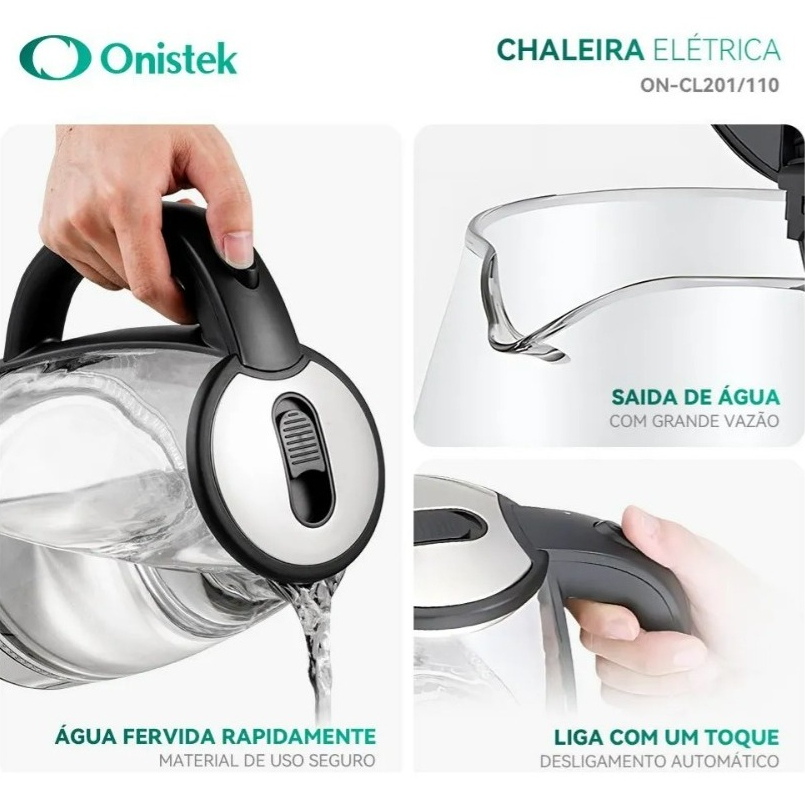 Chaleira Elétrica Onistek 1,8L de Vidro Transparente | 110V/1200W, Fervura Elegante à Vista Ferve em 3 Minutos, Rápido e Prático 1200W/1500W de potência, água fervida em minutos – perfeito para café matinal ou miojo noturno! Vidro Borossilicato Ultra-Resistente Corpo em vidro transparente livre de BPA, sem cheiro de plástico, resistente a altas temperaturas – pureza visível. Mesmo material de mamadeiras, suporta de -30°C a 450°C – veja a pureza da água em tempo real. 5 Camadas de Segurança Auto-desligamento + proteção contra fervura a seco + base antiderrapante + trava infantil + filtro inox 304. 110V ou 220V Ideal para Viagens e Casa ótima para intercâmbio, viagens ou uso doméstico. Base Giratória 360°, Uso com Uma Mão Cabo removível, desligamento automático e proteção contra fervura a seco – total segurança. Compre agora e transforme sua rotina com a Onistek! "chaleira lightshow"! Aqui estão os benefícios da Chaleira Elétrica Onistek Potência1500W 127v Potência1200W: 1. *Capacidade Generosa*: Permite preparar várias xícaras de bebidas quentes de uma só vez, ideal para famílias ou reuniões. 2. *Aquecimento Rápido*: Economia de tempo e energia com uma resistência que ferve a água em poucos minutos. 3. *Design Moderno*: Adiciona elegância e sofisticação à cozinha, combinando com qualquer estilo de decoração. 4. *Segurança Garantida*: Desligamento automático que previne acidentes ao interromper o aquecimento quando a água atinge a fervura. 5. *Facilidade de Uso*: Base giratória 360° que permite manuseio de qualquer ângulo, tornando o uso mais prático. 6. *Água Pura*: Filtro removível que assegura uma água mais limpa e fácil manutenção. 7. *Praticidade no Manuseio*: Alça ergonômica que facilita o uso diário, oferecendo conforto. 8. *Durabilidade*: Construção em Aço Inox e PP, materiais que garantem maior resistência e longevidade do produto. 9. *Versatilidade*: Base giratória 360° e botão de liga/desliga automático que proporcionam uma experiência de uso simplificada e eficiente. 10. *Economia de Energia*: A chaleira consome menos energia devido ao aquecimento rápido, tornando-a uma escolha econômica. Especificações técnicas:110v - Potência: 1200w. - Voltagem: 127v - Frequência: 60 Hz - Capacidade: 1.8 Litros. - Desligamento automático - Cabo de alimentação: 3cm x 0,75cm x 75cm. - Efeito de luz interno