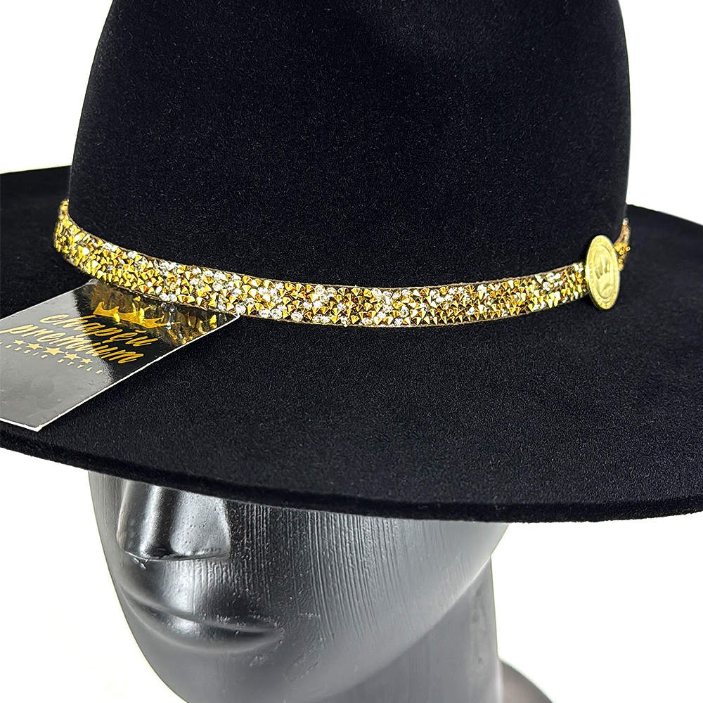 Chapéu Country Fedora Bandinha Strass Cascalhos Dourados Unissex Aba Média Estilo Sertanejo Lauana Castela Rodeio