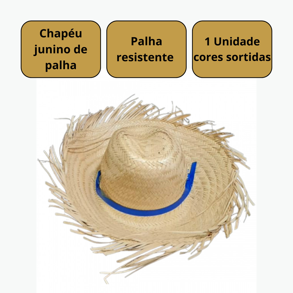 # **MERCADORIA ENVIADA DE FORMA SORTIDA** **Descrição:** Celebre a Festa Junina com autenticidade e economia! Nosso chapéu de palha é o acessório ideal para completar seu traje caipira. Além de charmoso, vem com um preço que cabe no seu bolso. Aproveite e entre no clima das festividades com muito estilo!