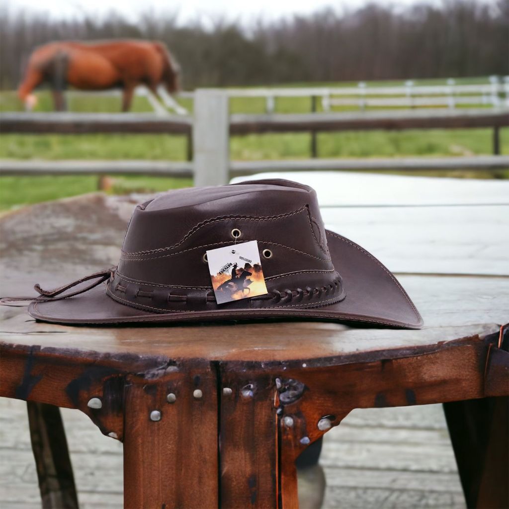 Chapéu modelo Australiano em COURO LEGITIMO , de altíssima qualidade. O modelo Australiano e fabricado nos tamanhos M, G e GG M 54-55 CM G 56-57 CM GG 58-59 CM Características - Tamanho aproximado da aba 6,5 cm (frente) Copa 10 cm (lateral) - Carneira elástica para maior conforto - Acabamento interno todo forrado - Arame super reforçado em aço nas abas - Costura e acabamento de alta qualidade - Banda trançada em couro - Forrado em material têxtil Qualquer Dúvida nos pergunte no campo abaixo.
