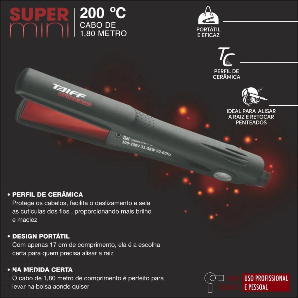Chapa Supermini Bivolt Action: A aliada Perfeita para Cabelos Sempre LindosDescrição do ProdutoPequena, mas com grande potencial: a chapa Supermini é perfeita para levar na bolsa aonde quiser! Com apenas 17 cm, é ideal para alisar a raiz e retocar penteados. Seu revestimento de cerâmica protege os fios do contato direto com a chapa, facilitando o deslizamento e proporcionando mais maciez e brilho. Além disso, seu design compacto a torna prática e fácil de transportar. O modelo Super Mini Chapinha Cabelo Titanium Prof da renomada marca Taiff é sinônimo de qualidade e eficiência. Seu aquecimento cerâmico de PTC garante uma temperatura constante, resultando em maior segurança e saúde para os seus fios. Com bivolt automático, você pode utilizá-la em qualquer lugar sem preocupações. O cabo de 1,80 metro de comprimento oferece a liberdade de movimento que você precisa, mesmo em ambientes pequenos. Atributos do ProdutoMarca: Taiff Modelo: Super Mini Chapinha Cabelo Titanium Prof Benefícios em DestaqueCom a Chapa Supermini Biv. - Action, você terá cabelos sempre impecáveis, seja em casa, no trabalho ou em viagens. Sua tecnologia avançada aliada ao design compacto a tornam a escolha perfeita para quem busca praticidade sem abrir mão da qualidade. Diga adeus aos fios rebeldes e invista em um visual incrível em poucos minutos. a Sua Chapa Supermini Bivolt Action! agora mesmo a oportunidade de ter cabelos deslumbrantes em qualquer lugar. Garanta já a sua Chapa Supermini Biv. - Action e descubra um novo mundo de possibilidades para o seu cabelo!