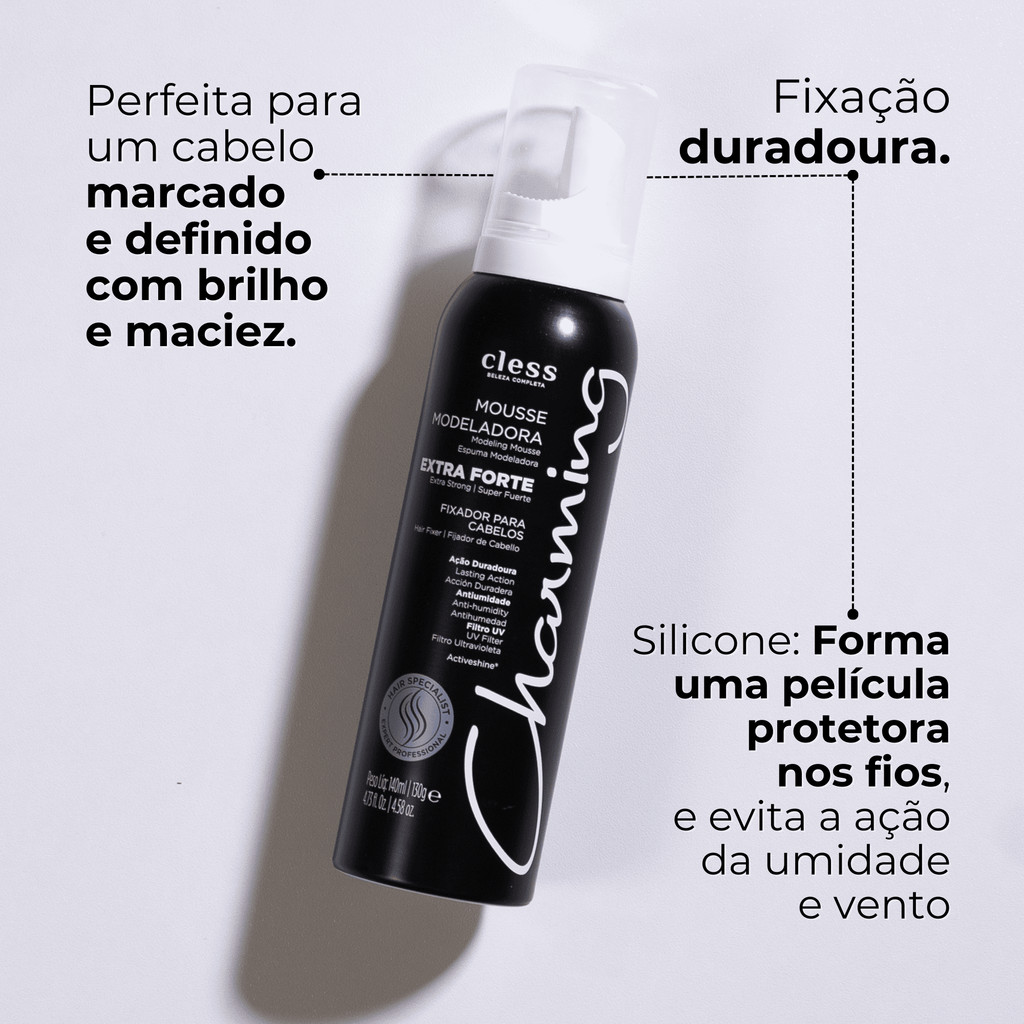 A Charming Mousse Modeladora Extra Forte 140ml, da Cless Cosméticos, é um finalizador capilar desenvolvido para proporcionar fixação intensa e longa duração aos penteados, mantendo os fios modelados e volumosos por até 72 horas. ✨ Características principais: Fixação Extra Forte: Ideal para modelar, definir, estilizar e reduzir ou proporcionar volume aos fios. Isenta de Álcool Etílico: Protege a saúde dos fios. Ingredientes ativos: Pró-Vitamina B5: Hidrata e fortalece os fios. Proteínas da Seda: Proporcionam maciez e brilho. Silicone: Forma uma película protetora, garantindo brilho e controle do frizz. Ação Revitalizante: Combate o ressecamento e proporciona um acabamento profissional. Fácil Remoção: Pode ser facilmente retirada com uma simples escovação, sem deixar resíduos. 💆 Modo de uso: Agite bem o frasco da mousse, virando-o de cabeça para baixo na posição vertical. Pressione a válvula, espalhe a espuma nas duas mãos e aplique-a em todo o cabelo. Finalize o penteado modelando com o auxílio dos dedos, pente, escova ou secador com difusor. Se necessário, aplique mais mousse.