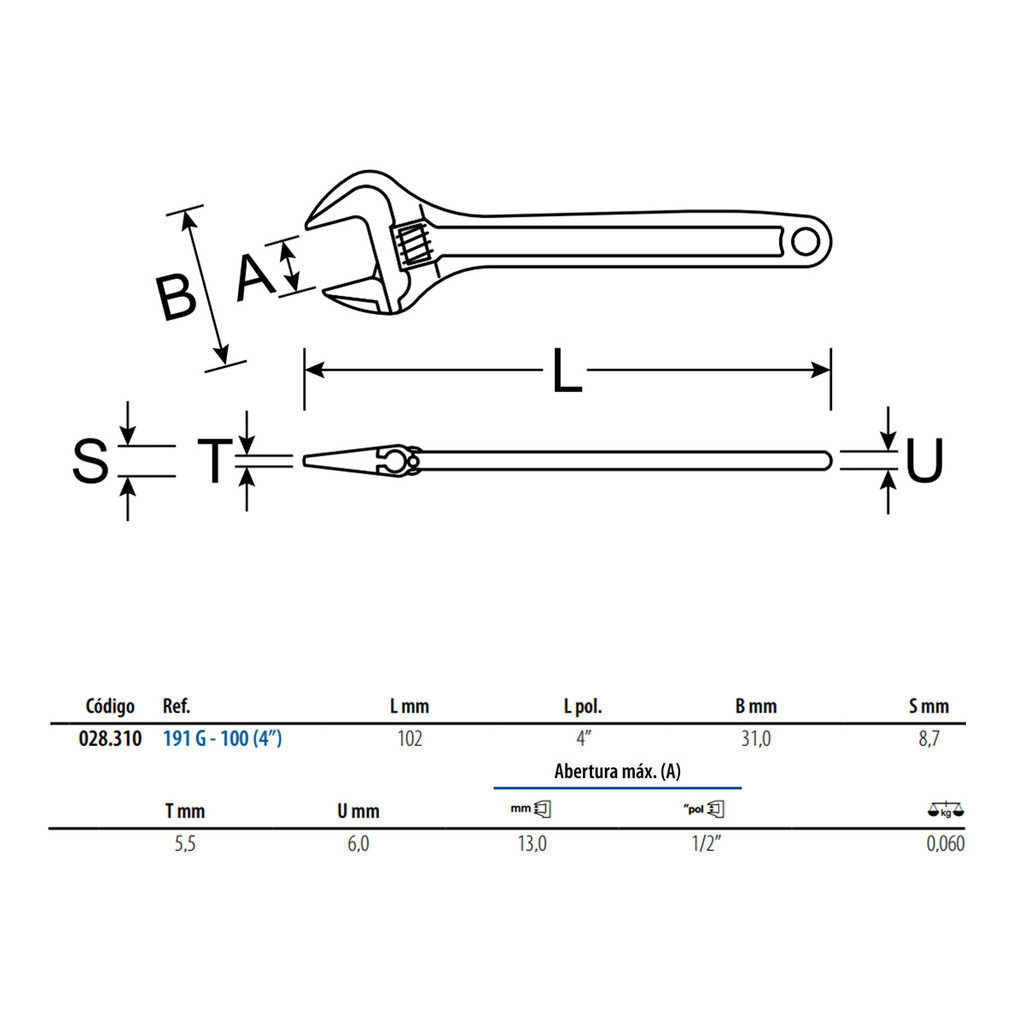 Chave Ajustável 4" (100mm) Gedore 191G-100 Descrição: - Fabricada em aço GEDORE-Vanadium; - Acabamento escurecido; - Endurecida e temperada, a chave ajustável oferece alta resistência mecânica, assegurando uma excelente performance por muito mais tempo; - Cabeça lixada; - Modelo sueco: inclinação de 15° da cabeça em relação ao cabo garante estabilidade no manuseio. Dados Técnicos: - Marca: Gedore; - Modelo: 028310; - Referência: 191G-100; - Comprimento total: 4" ou 100mm; - Abertura máxima: 1/2" ou 13mm; - Peso: 0,060Kg. Componentes Inclusos: - 01 Chave Ajustável 4" (100mm) Gedore 191G-100.