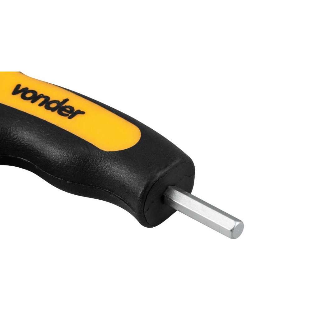 Marca: Vonder Código: 3573040201 Conteúdo da embalagem 1 Chave hexagonal (allen) abaulada com cabo. Destaques e diferenciais: Produzida em aço cromo vanádio, proporcionando excelente resistência mecânica. Possui formato tipo L além de cabo com revestimento emborrachado e formato ergonômico tipo "T", que facilita ao usuário os movimentos manuais de aperto e desaperto e proporciona maior conforto na operação. Ambas as extremidades podem ser utilizadas dependendo do local onde será realizado o trabalho. Ao utilizar a haste mais longa é possível alcançar locais de difícil acesso além de promover uma operação mais rápida, enquanto a haste mais curta promove um maior torque, pois a extremidade longa funciona como alavanca. Conta ainda com uma das pontas abaulada conferindo maior facilidade para trabalhos em locais de difícil acesso. Aplicações e dicas de uso: Indicada para apertar e soltar parafusos com encaixe sextavado interno. Medida: 4,0 mm Tipo da ponta: Haste longa: hexagonal abaulada / Haste curta: hexagonal Material : Aço cromo vanádio Acabamento: Acetinado Comprimento: 200 mm Altura útil: 150 mm Tipo de cabo: Tipo "T" Massa aproximada (peso) (kg): 0,048 kg Garantia - E (CDC): Garantia legal: 90 dias