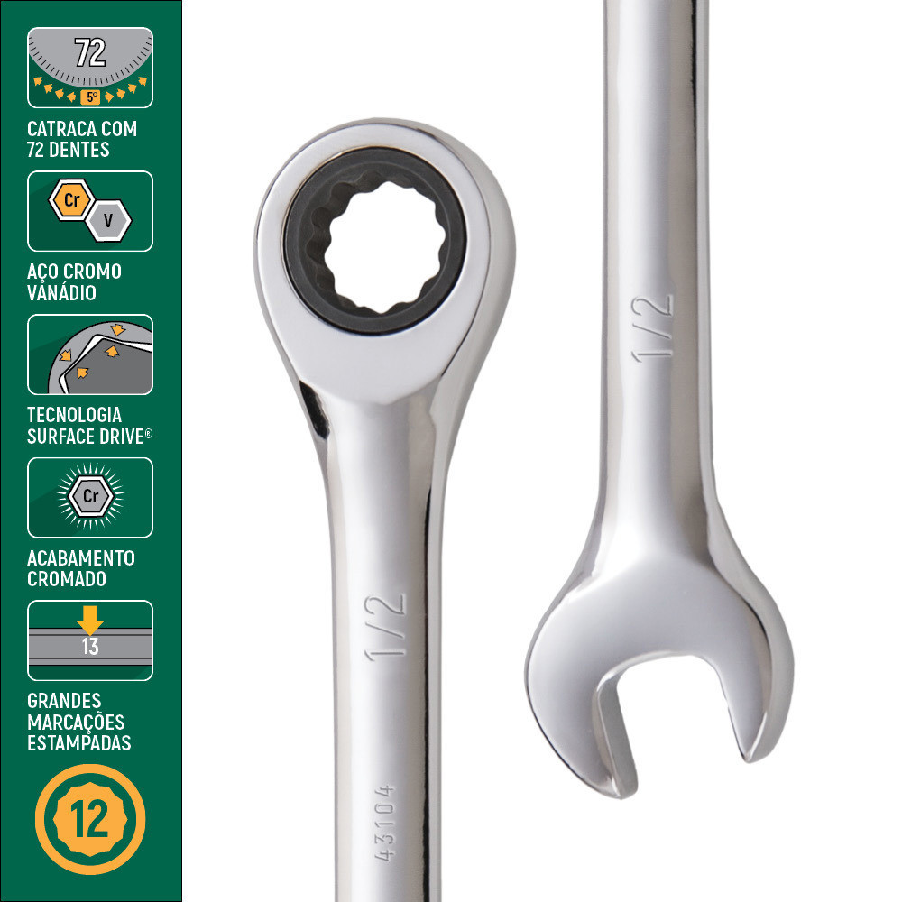 Chave Combinada Com Catraca 1/2" Sata ST43104ST Descrição do Produto: - Chave combinada com catraca de qualidade profissional superior, possuí 72 posições proporcionando um arco de giro de apenas 5° ideal para espaços de difícil alcance ou apertados. Chave duas em uma possuí chave de boca de um lado e uma chave estrela com catraca do outro, com tecnologia surface drive, para abraçar o parafuso ou a porca com mais segurança e facilitar pra você apertar ou desapertar eles sem muito esforço, mesmo em situações complicadas. Vantagens: - 72 dentes proveem maior exatidão ao movimento e resistência à chave; - Liberação rápida de 72 dentes catraca com 5º arco de giro para curvas mais apertadas; - Tecnologia Surface Drive evita que a cabeça do parafuso espane, garantindo maior produtividade para o usuário e menor custo; - Do lado da estrela possui uma catraca que permite a execução de trabalhos com menor esforço do que os modelos de chaves simples, pois dispensa a retirada da chave para novo movimento de apertar e soltar; - Grandes marcações de tamanho estampado fornecem identificação rápida; - Feito de Aço Cromo-Vanádio que oferece maior durabilidade e resistência; - Acabamento 100% Cromado e polido muito mais segura, pois a camada de cromo não descasca e prática por ser mais fácil de limpar. Dados técnicos: - Marca: Sata; - Modelo: ST43104ST; - Tamanho da chave: 1/2"; - 72 Dentes; - Material: Aço Cromo-Vanádio (Cr-V); - Dimensões do produto: 1,5x4,5x24cm; - Peso: 0,110Kg. Componentes inclusos: - 01 Chave Combinada Com Catraca 1/2" Sata ST43104ST.
