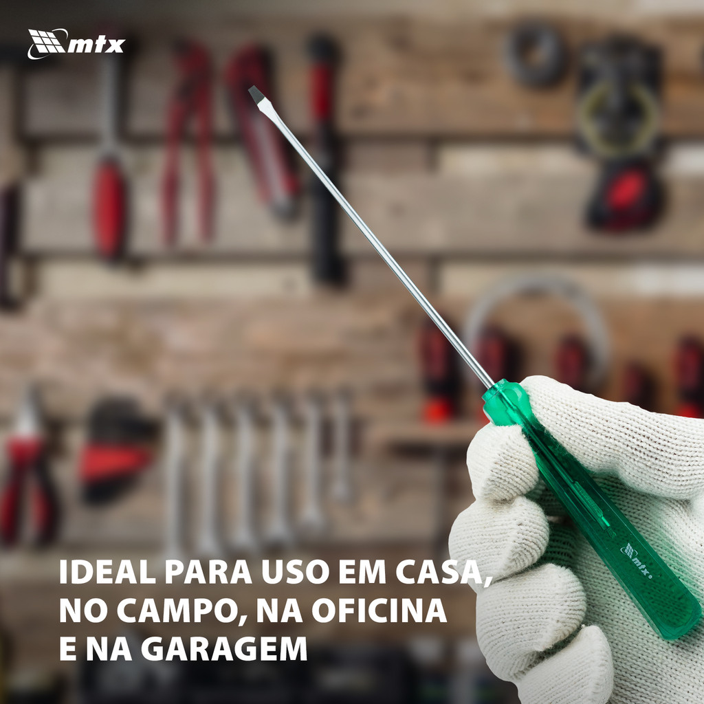 A Chave de Fenda MTX Cabo Verde 1140455 é uma ferramenta projetada para atender às exigências de trabalhos com fixadores de rosca, combinando força, durabilidade e precisão. Com um comprimento de haste de 6"" (150 mm) e uma ranhura de 1/8"" (SL3), esta chave de fenda é ideal para uma ampla gama de aplicações, sendo um item indispensável em casa, na casa de campo, na oficina e na garagem. Detalhamento das Vantagens: Força e Resistência à Carga: Fabricada com aço CrV de alta qualidade, a haste da Chave de Fenda MTX Cabo Verde 1140455 oferece uma combinação ideal de força e flexibilidade, permitindo que a ferramenta suporte cargas elevadas sem risco de deformação ou quebra. Este material de primeira linha assegura uma performance confiável em todos os tipos de tarefas. Alta Durabilidade: A dureza da haste, avaliada em 52 HRC, garante uma resistência superior ao desgaste, prolongando a vida útil da ferramenta mesmo sob uso intensivo. O acabamento niquelado da superfície não apenas proporciona uma estética refinada, mas também oferece uma proteção eficaz contra a corrosão, mantendo a chave de fenda em excelentes condições por mais tempo. Colocação Conveniente no Suporte: A inclusão de um cartão de suspensão é um detalhe que reflete o compromisso da MTX com a conveniência e organização. Esta característica permite um armazenamento e acesso fácil da ferramenta, facilitando a manutenção da ordem na área de trabalho e otimizando o fluxo de trabalho. Aplicações Versáteis: A Chave de Fenda MTX Cabo Verde 1140455 é a escolha perfeita para quem busca uma ferramenta versátil e eficaz. Seu design e tamanho são ideais para trabalhos que exigem precisão, como montagem de móveis, manutenção eletrônica, ajustes automotivos e uma variedade de projetos de DIY (faça você mesmo), tornando-a uma adição valiosa a qualquer conjunto de ferramentas. Com a Chave de Fenda MTX Cabo Verde 1140455, você tem garantia de uma ferramenta de alta performance, pronta para enfrentar os desafios mais exigentes de fixação. A combinação de materiais de alta qualidade, design inteligente e funcionalidades práticas fazem desta chave de fenda uma escolha excepcional para profissionais e entusiastas do faça você mesmo que não abrem mão de eficiência e durabilidade em seus trabalhos.