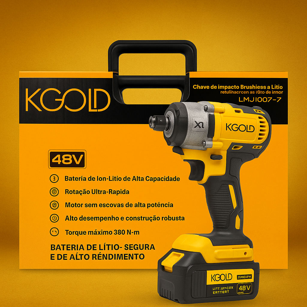 🚀 DESCRIÇÃO PROFISSIONAL – KGOLD CHAVE DE IMPACTO 48V BRUSHLESS A KGOLD apresenta sua nova Chave de Impacto Profissional 48V, equipada com motor Brushless de alto desempenho, bateria de longa duração e força de torque ideal para trabalhos pesados. Projetada para profissionais que exigem durabilidade, potência real e ergonomia superior, este modelo é líder no melhor custo-benefício da categoria. Com duas baterias de íon-lítio de 48V e tecnologia aprimorada, você pode trabalhar por longos períodos sem interrupções. A luz LED integrada facilita o uso em áreas de baixa visibilidade, enquanto o cabo emborrachado garante firmeza e confo ⚙️ ESPECIFICAÇÕES TÉCNICAS – KGOLD 48V BRUSHLESS Velocidade (rpm/min): 0–1700 / 0–2300 Impacto (ipm): 0–2600 / 0–3100 Torque Máximo: 180–38 Peso: 1,75 kg T Íons de Lítio Carregamen Biv Tensão 48 Motor Brushless (sem e – Temperatura de operação: 0–40 ºC 🔋 DESTAQU ✔ Motor Brushless – mais ✔Torque rea – i ✔Bateria 48V de alta capacidade – auton ✔ Ergono – pega ✔Luz LE – pe ✔Controle reversível e múltiplas velocid 📦 C 02 Ba 01 Carregador bivolt 110/220V 01 Adaptador com rosca para mandril 01 Mandril 1/2" 02 Brocas 06 Soquetes de impacto (17mm a 22mm) 17mm 18mm 19mm 20mm 21mm 22mm 01 Maleta de transporte reforçada 💛 POR QUE ESCOLHER A KGOLD? A KGOLD é reconhecida no mercado por: Produzir ferramentas confiáveis, robustas e de alta durabilidade Projetos com design moderno e ergonomia profissional Alta performance real, ideal para mecânicos, instaladores e profissionais de obra Garantia e suporte ao cliente