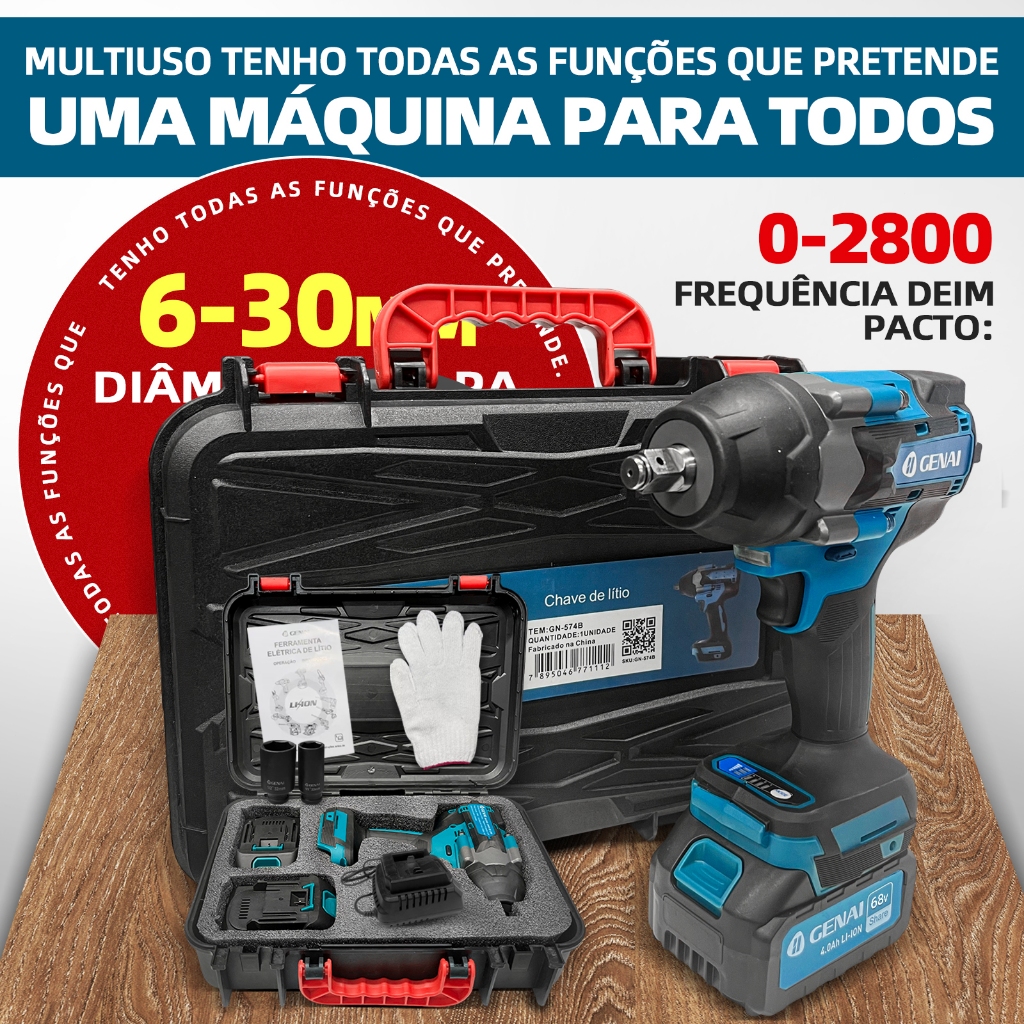 Chave de Impacto 68V Bivolt com Motor Brushless – Alta Performance e Durabilidade A Chave de Impacto 68V Bivolt é uma ferramenta profissional projetada para oferecer máximo torque (700 N.m) e eficiência, ideal para trabalhos pesados que exigem força, velocidade e precisão. Equipada com motor brushless (sem escovas), ela proporciona maior vida útil, menor desgaste e mais potência em comparação a modelos tradicionais. Destaques Técnicos: ✅ Torque Máximo: 700 N.m – Uma das mais potentes do mercado, capaz de apertar e desapertar parafusos e porcas de alta resistência com facilidade. ✅ Motor Brushless: Tecnologia avançada que elimina escovas, reduzindo atrito, aumentando a eficiência energética e prolongando a vida útil da ferramenta. ✅ Velocidade Ajustável: 0–2.400 RPM e 0–3.000 IPM (impactos por minuto), permitindo controle preciso para diferentes aplicações. ✅ Bateria de Longa Duração: 2x Baterias 68V 6.0Ah Li-Ion, garantindo autonomia prolongada e recarga rápida. ✅ Carregador Bivolt (110V–220V): Praticidade para uso em qualquer rede elétrica. ✅ Design Ergonômico: Empunhadura antiderrapante e luz LED para melhor visibilidade em ambientes escuros. ✅ Reversível: Controle de sentido horário e anti-horário para maior versatilidade. ✅ Soquete incluído: O produto vem com soquetes de 22 mm e 32 mm, funcionando em carros e caminhões Aplicações Profissionais: ✔ Troca de rodas em veículos médios e pesados (carros, caminhões, máquinas agrícolas). ✔ Manutenção industrial, construção civil e oficinas mecânicas. ✔ Apertos e desapertos de parafusos de alta resistência em estruturas metálicas. Vantagens Exclusivas: 🔹 Maior durabilidade (motor sem escovas = menos manutenção). 🔹 Menos ruído e vibração para maior conforto no trabalho. 🔹 Eficiência energética superior, maximizando o uso da bateria. Acessórios Inclusos: 2x Baterias 68V 6.0Ah Li-Ion 1x Carregador Bivolt (110V–220V) 1x Maleta resistente para transporte 1x Alça de segurança 1x 22MM Sleeve 1x 32MM Sleeve 1x Luvas de proteção em fibra Ideal para mecânicos, técnicos e profissionais que buscam uma ferramenta potente, durável e versátil! 🚀 Desafie os limites do seu trabalho com a Chave de Impacto 68V Brushless – Potência e Tecnologia em suas mãos!