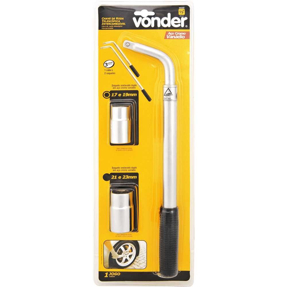 Chave de roda telescópica intercambiável VONDER Haste prolongada com encaixe quadrado de 1/2". Cabo telescópico metálico reforçado tipo L com empunhadura plástica. Indicada para apertar e soltar parafusos e porcas de rodas. Especificações Técnicas: Material do corpo: Aço carbono (SAE 1045) Acabamento: Cromado fosco Material do soquete: Aço cromo vanádio Encaixe quadrado da chave de roda: 1/2" Comprimento da chave (estendida): 530 mm Comprimento da chave (fechada): 350 mm Medida dos soquetes que acompanham a chave: 17 mm/19 mm e 21 mm/23 mm Massa aproximada (peso) (kg): 1,2 kg Conteúdo Da Embalagem: 1 Chave de roda. Acompanha: 2 soquetes duplos (17 mm/19 mm e 21 mm/23 mm).