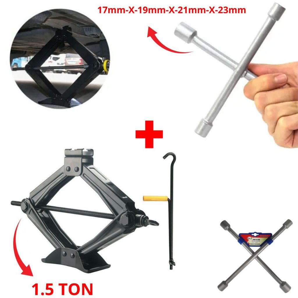 Chave de Roda Universal Estrela 17X19X21X23mm Grande Longa Reforçado + Macaco Sanfona Mecanico