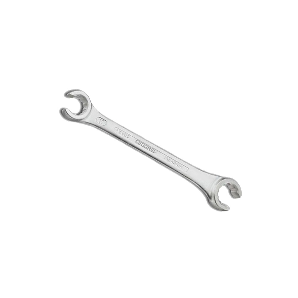 Aço Gedore-Vanadium. Acabamento niquelado e cromado. Para uso em tubulações de sistemas de refrigeração, hidráulico e pneumático. Dois lados Unit Drive ou sextavado aberto com medidas diferentes. O ângulo de inclinação em relação ao corpo é de 15º ou 30º, de acordo com o modelo. Dados técnicos: - Referência: 400-19x22mm - Medidas: 19x22mm - Ângulo de inclinação: 15º