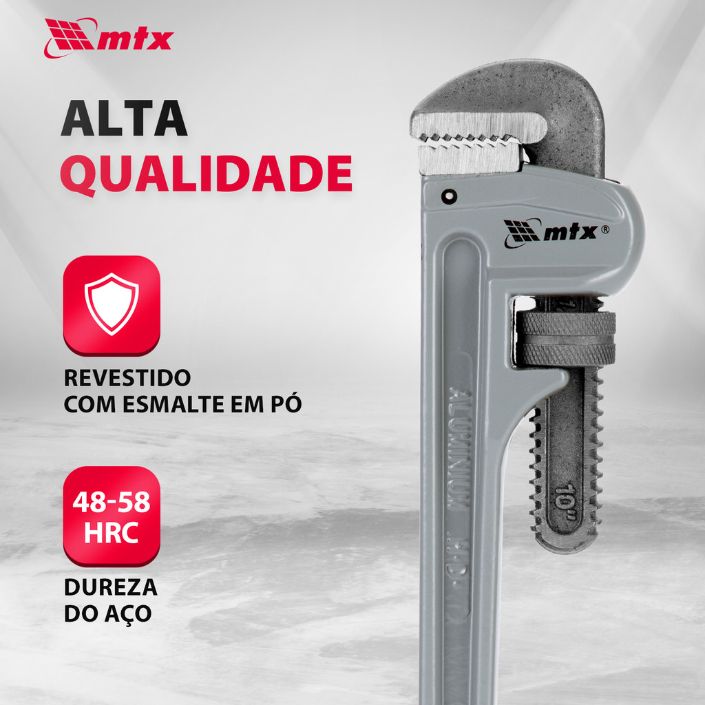 Chave Grifo Tipo Americano MTX 1560155 – 10" Leveza, resistência e praticidade para profissionais exigentes A Chave Grifo Tipo Americano MTX 1560155, com 10" de comprimento, foi projetada para oferecer alta eficiência e confiabilidade no manuseio de tubos e peças com até 34 mm de diâmetro. Fabricada em alumínio, alia leveza e resistência, sendo ideal para encanadores, mecânicos e artesãos domésticos que buscam desempenho e durabilidade. Principais vantagens Força e durabilidade Construída em alumínio com dureza entre 48 e 58 HRC, combina leveza e robustez para suportar o uso diário intenso. Mantém a integridade estrutural e funcionalidade mesmo sob condições exigentes. Proteção contra corrosão e desgaste Corpo revestido com esmalte em pó e superfícies de trabalho tratadas por fosfatização, garantindo proteção eficaz contra corrosão e danos ambientais. Aumenta a vida útil e preserva a eficácia da ferramenta. Conforto no uso prolongado O material leve reduz a fadiga, permitindo uso contínuo com maior conforto e eficiência, fundamental para profissionais que utilizam a ferramenta diariamente. Armazenamento prático Alça com orifício para pendurar, facilitando o armazenamento em oficinas, garagens ou veículos de trabalho, otimizando o espaço e o acesso rápido. Indicações de uso Instalações hidráulicas residenciais e comerciais Reparos automotivos e mecânicos Projetos de construção e manutenção em geral Trabalhos que exigem precisão, resistência e conforto Uma ferramenta indispensável para profissionais A Chave Grifo Tipo Americano MTX 1560155 une design inovador e materiais de alta qualidade para entregar performance confiável, conforto e durabilidade. Uma escolha acertada para quem não abre mão de ferramentas eficientes e resistentes no dia a dia.