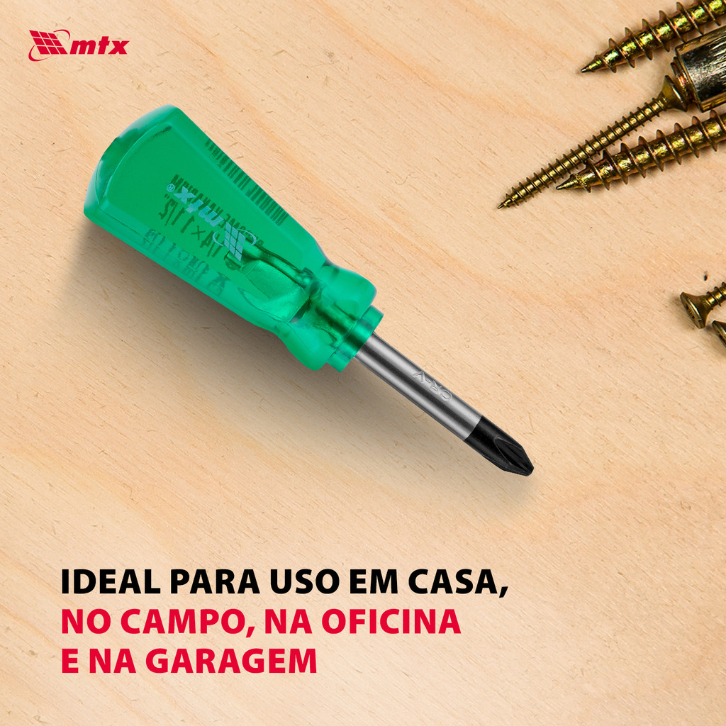 Chave Phillips MTX Cabo Verde Precisão, durabilidade e desempenho em qualquer tarefa A Chave Phillips MTX Cabo Verde foi desenvolvida para proporcionar eficiência e confiabilidade em trabalhos com fixadores de rosca. Seja em reparos domésticos, montagens técnicas ou aplicações mais exigentes em oficinas, ela se destaca pela sua qualidade construtiva e versatilidade, sendo indispensável em qualquer kit de ferramentas. Principais diferenciais Força e resistência superior Fabricada em aço cromo-vanádio (CrV) de alta qualidade, a haste suporta cargas intensas sem deformações ou quebras. Ideal para uso contínuo e exigente, com excelente resistência mecânica. Alta durabilidade e proteção Dureza da haste: 52 HRC, garantindo excelente resistência ao desgaste. Acabamento niquelado, que protege contra corrosão e mantém a ferramenta em ótimo estado por mais tempo. Organização prática Acompanha cartão de suspensão, que facilita o armazenamento e o acesso rápido à ferramenta. Perfeita para manter bancadas e oficinas organizadas. Versatilidade de aplicação Ideal para tarefas como montagens, reparos eletrônicos, ajustes finos e manutenções gerais. Seu design ergonômico e dimensões compactas facilitam o uso em locais apertados ou de difícil acesso, com conforto e precisão.