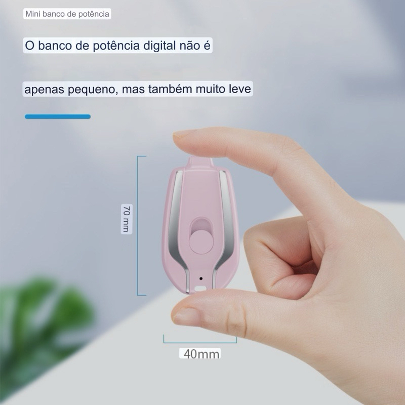 Ele foi projetado para permitir que os usuários nunca mais fiquem sem bateria ao sair de casa. Com o chaveiro power bank você pode usá-lo a qualquer momento, é compacto e pode ser guardado no bolso. Pode ser usado como segunda opção em caso de emergência. Pequeno, discreto, sem necessidade de cabos Compatível com qualquer dispositivo com conectividade Type-C e iOS. Capacidade da bateria: 1800mAh Clipe embutido: prende-se facilmente a uma mochila, cinto, arnês ou qualquer alça de segurança para que seu carregador retrátil esteja sempre ao seu alcance. Obs: O chaveiro carregador é um ótimo auxiliar para cargas emergenciais. Portanto, não pode ser comparado aos carregadores tradicionais por se tratar de um mini formato desenvolvido para compensar a escassez temporária de baterias. A capacidade é de 1800mAh depois de totalmente carregada. Cada smartphone possui uma capacidade de carregamento diferente.