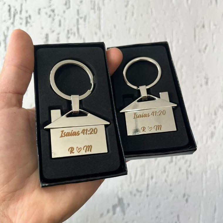 CHAVEIRO METÁLICO FORMATO CASA COM ESTOJO – PERSONALIZADO A LASER Apresente sua marca com elegância por meio deste sofisticado chaveiro em formato de casa, ideal como brinde corporativo personalizado. Conteúdo do Kit: 02 (duas) unidades de chaveiro em metal com acabamento brilhante, no formato de casa; - Personalização a laser de alta precisão; - Estojo com espuma e caixa preta, proporcionando uma apresentação refinada e pronta para entrega. Personalização: - Permite a gravação de logotipo, nomes, numeração de quartos ou acomodações; - A gravação a laser não possui aplicação de cores, garantindo um acabamento discreto e de alta fidelidade aos detalhes da arte. Informações Importantes: - Após a confirmação da compra, é imprescindível o envio da arte para personalização de forma imediata por meio do chat disponível na plataforma; - Na ausência do envio da arte dentro do prazo, o produto será despachado sem personalização; - Não realizamos envio de arte para aprovação prévia. - A gravação do item é feito somente em um lado, para adicionar gravação no verso oferecemos a opção de adcional de gravação de 15,00 por item que pode ser alinhado via chat de mensagens. Especificações Técnicas: Dimensões: 7,6 cm (comprimento) x 4,9 cm (largura); Peso aproximado: 33 g.