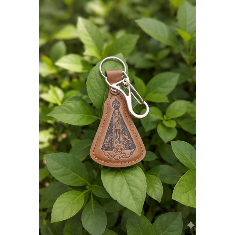 Chaveiro De Couro Com Mosquetão Nsa Aparecida Crucifixo Com Gancho e Argola