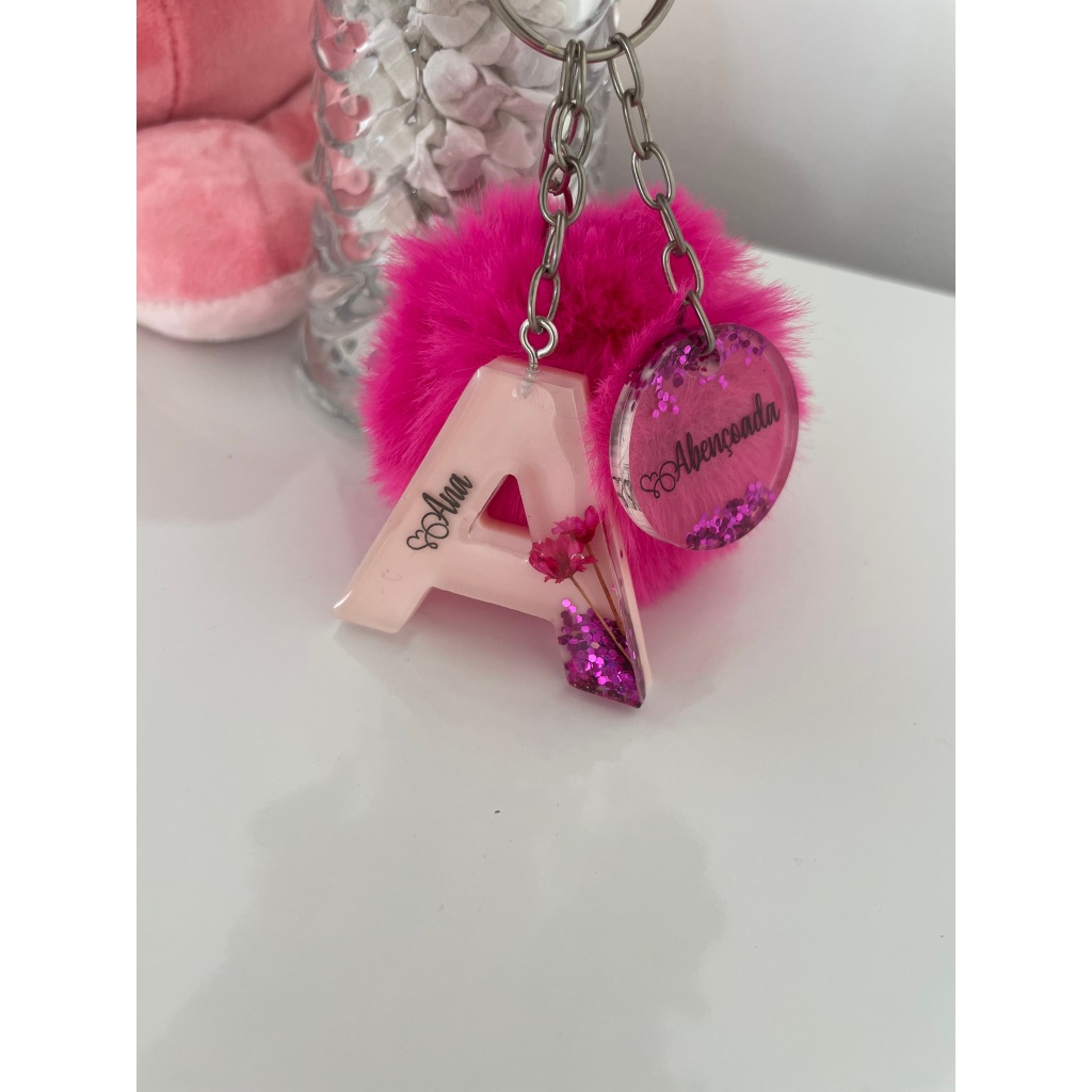 Chaveiro de letra + Pompom + chaveiro redondo de resina
