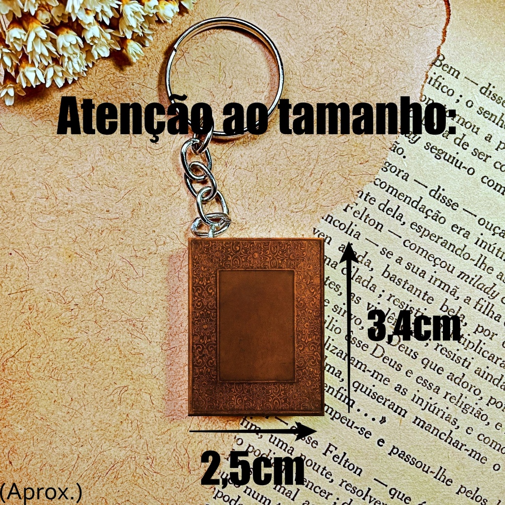 Chaveiro Mini Livro – perfeito para amantes da leitura. Informações importantes (LEIA ATENTAMENTE ANTES DE COMPRAR). - Réplica realista: Reproduz capa, contracapa e lombada do livro original. - Interior: Feito com material de borracha. O mini livro NÃO ABRE. - Capa: Impressão em papel de alta qualidade, envernizada e laminada, garantindo maior durabilidade. - Tamanho: Aproximadamente 3,4 cm de altura x 2,5 cm de largura. - Prazo de envio: 7 DIAS ÚTEIS de produção, será enviado após esse prazo (ou antes), pois não temos estoque, somente sob encomenda. - Prazo de entrega: De 5 a 7 dias úteis. - Feito à mão: Por ser artesanal, cada peça pode apresentar pequenas variações, sem alterar o design do produto. - Personalizados: Produzimos com o livro e a edição de sua escolha. Basta entrar em contato pelo chat e efetuar a compra no anúncio específico de personalizados. - Descontos especiais a partir de 20 unidades. - Para comprar modelos diferentes, adicione cada um separadamente ao carrinho antes de finalizar a compra.