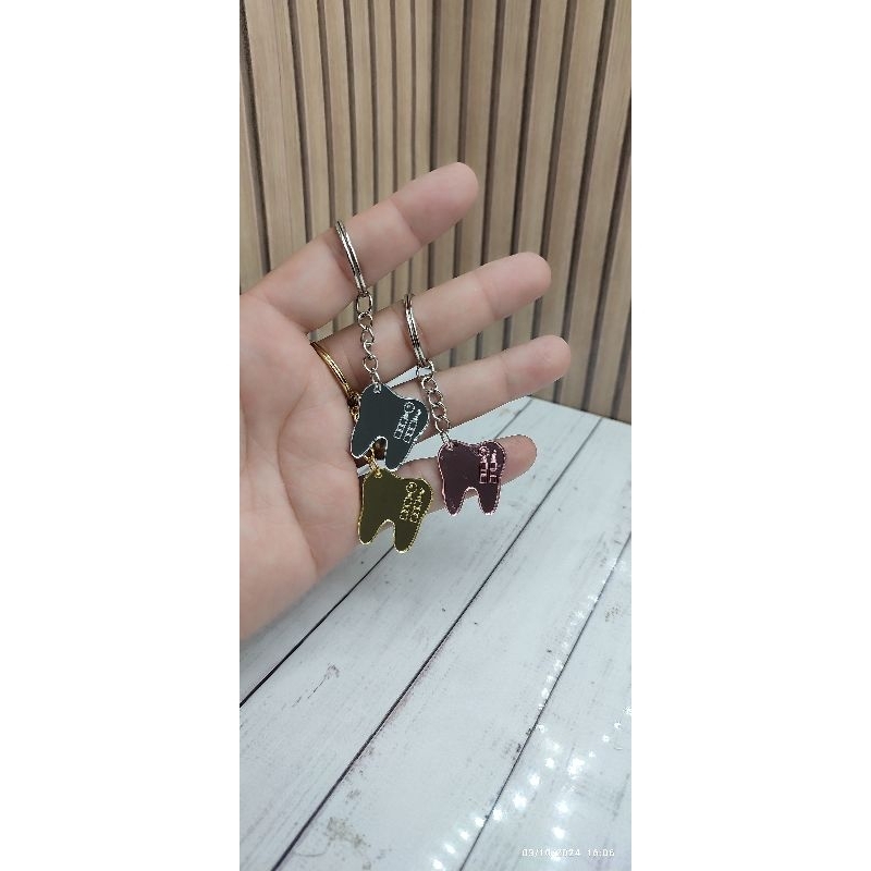 chaveiro de acrílico espalhando formato dente com detalhes de ferramenta odontológica ,pra lembrancinha não personalizamos..