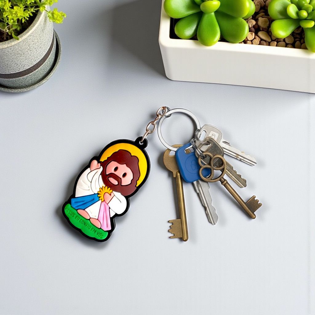 Chaveiro emborrachado Jesus Misericordioso, produzido em material macio, leve e resistente. Possui excelente acabamento e cores vivas, ideal para demonstrar sua fé no dia a dia. Pode ser usado em chaves, mochilas, bolsas ou até mesmo como lembrancinha religiosa. ✨ Características: - Material: borracha emborrachada (PVC) - Design: Jesus Misericordioso - Leve e durável - Ideal como lembrança de eventos religiosos, encontros de fé ou uso pessoal - Tamanho total com a argola: 11cm