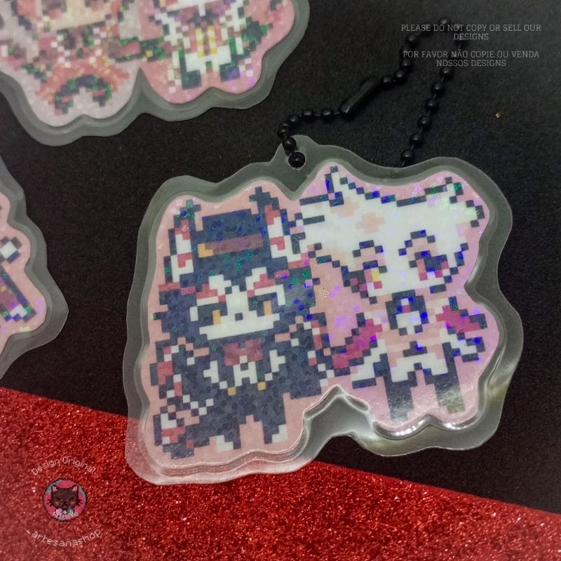 Pingente impresso plastificado e holográfico FANMADE inspirado nos personagens de Hazbin Hotel, de mãos dadas, com arte em nosso estilo pixel art Hana. Em um lado do pingente eles estão de olho aberto, e do outro piscando. Mais sobre o produto: ✧ TAMANHO MÉDIO de cada pingente: 6CM x 5CM. ✧ As pixel arts dos pingentes são impressas frente e verso, possuem uma camada holográfica e são seladas por calor com POUCH FILM. ✧ O QUE É POUCH FILM? Um plástico de folha dupla usado para proteger documentos, garantindo proteção contra poeira, água, umidade e desgaste, aumentando a vida útil da impressão. NÃO se trata de um chaveiro de acrílico ou de plástico em relevo. ✧ Nossos pingentes são cobertos por uma camada holográfica. Os padrões holográficos disponíveis no momento estão na última foto do anúncio; caso tenha preferência por um deles inclua no campo de mensagens do checkout, se não mandaremos um aleatório. ✧ Os pingentes plastificados são artesanais e estão sujeitos à pequenas variações devido ao processo de impressão, corte e montagem, assim como uma possível diferença de cor na impressão ou na tonalidade da corrente por conta de iluminação e disponibilidade. TEMPO DE PRODUÇÃO: Todos os nossos produtos são sob encomenda, isso quer dizer que não temos estoque fixo. Cada produto é montado a partir do seu pedido, portanto o tempo de envio vai depender da sua posição na nossa fila de pedidos. Tempo médio: de 3 a 7 dias úteis. ✧ A coleção Hana é um design criado pelo ateliê ArtesAna e a reprodução não é permitida. ✧ PRODUTO FANMADE (FEITO POR FÃS). Os direitos dos personagens pertencem aos criadores da mídia.