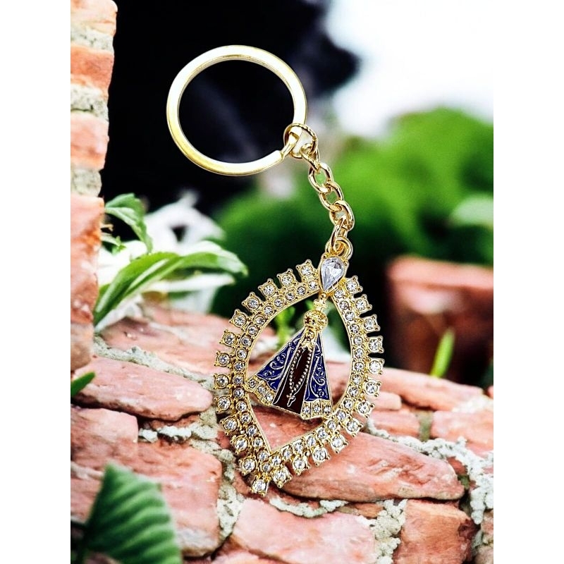 Chaveiro Nossa Senhora Aparecida com detalhes em strass que traz um brilho para a peça.
