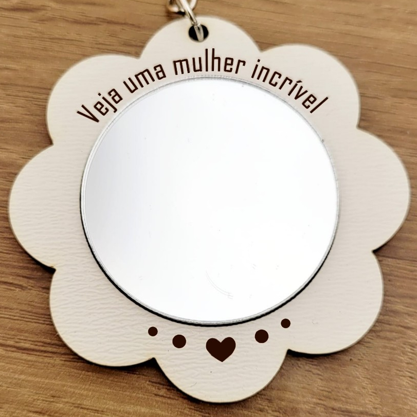 Linda lembrancinha para várias ocasiões com festas, presentear clientes, etc. Materiais do chaveiro. MDF branco 3mm Espelho 3,5cm Irá receber montado com espelho e argola. Não fazemos personalização na parte de trás. Película protetora no espelho deverá ser retirada após o recebimento do produto Produto sob encomenda com prazo atual de até 3 dias úteis para envio. Caso queira menor quantidade, procure em nossa loja, pois temos anúncios com variações entre 20 e 50 unidades