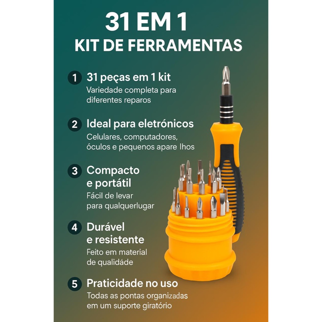 Um conjunto prático e versátil para todos os tipos de reparos e manutenções. Com 31 peças em um único kit, você terá à disposição chaves de precisão ideais para eletrônicos, celulares, óculos, computadores e muito mais. Compacto, leve e fácil de transportar, é a escolha perfeita para quem busca praticidade e eficiência no dia a dia.