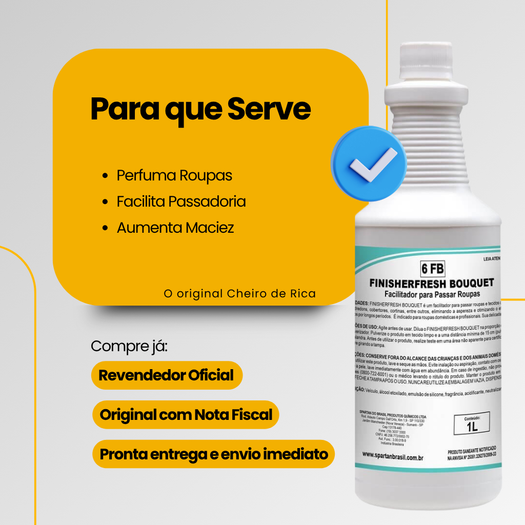O que você recebe ao comprar deste anúncio 1 Finisherfresh Spartan – Fragrância Bouquet – 1 Litro 🧺 Para que serve • Facilita a passadoria, reduzindo a aspereza dos tecidos • Perfuma roupas, toalhas, lençóis e cortinas com fragrância marcante • Aumenta a maciez e elimina a eletricidade estática • Proporciona toque suave e aroma duradouro após o uso do ferro ou calandra • Ideal para aplicação em tecidos de fibras naturais ou sintéticas 🛒 Por que comprar da Vesco Revendedor oficial Spartan Produto original com Nota Fiscal Pronta entrega e envio imediato Suporte especializado antes e depois da compra 👤 Quem pode utilizar Perfeito para lavanderias, hotéis, clínicas, salões, empresas de transporte têxtil e também para quem busca padrão profissional no cuidado com roupas em casa. 🧼 Nosso comentário e o uso deste produto O Finisherfresh Bouquet 1L é o finalizador de passadoria mais conhecido da Spartan. Sua fragrância floral refinada fixa nas roupas com o calor do ferro, deixando as peças mais suaves, cheirosas e com aparência de roupa bem tratada. A aplicação é simples: Agite antes de usar Aplique puro ou diluído (até 1:10) em forma de névoa com borrifador Passe normalmente com ferro ou calandra Resultado visível no toque e no cheiro já na primeira aplicação ❓ Perguntas Frequentes Posso aplicar sem passar a roupa? Pode, mas o perfume fixa melhor com o calor do ferro ou calandra. Precisa diluir? A diluição é opcional. Para uso intensivo e perfume mais forte, aplique puro. Para maior rendimento, pode diluir até 1:10. A fragrância é doce ou suave? A versão Bouquet é floral elegante, com perfume delicado, muito usada em roupas finas e enxovais. Serve para estofados e tapetes? Sim, mas recomenda-se diluição de até 1:50 e uso com extratora ou pulverizador.