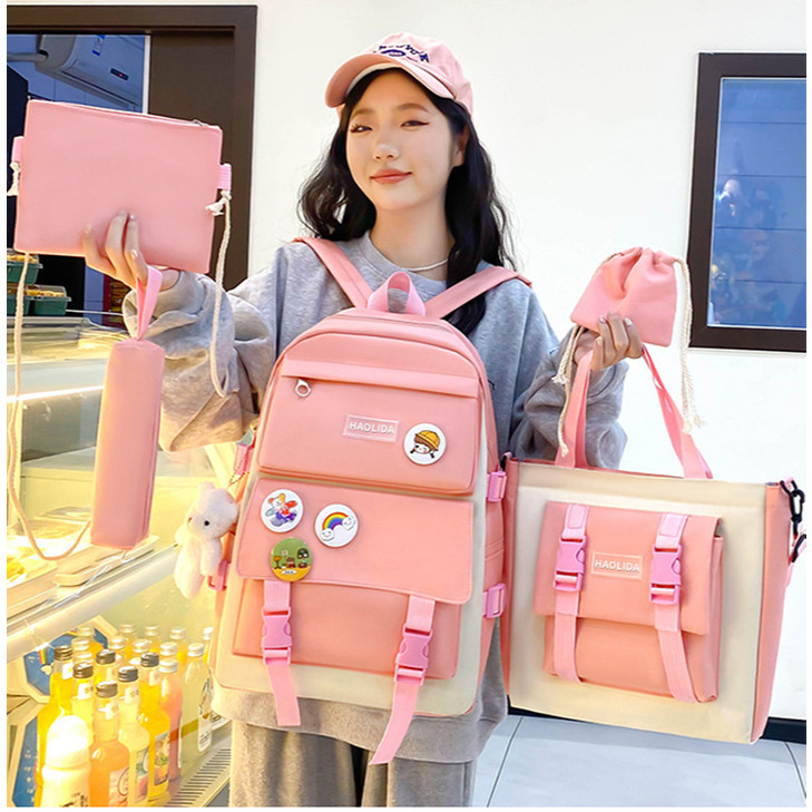 📌 Conjunto de bolsas femininas de cinco em um - estilo coreano escola e estilo Casual Adequado para estudantes, uso diário, trabalho ou viagem pequena! 🧵 Material da tela: Tecido de lona durável, leve e confortável para toque. 📐 Tamanho do item do item: 🎒 Mochila de Mochila Tamanho 1: Comprimento 29cm X Altura 41cm X Profundidade 13cm Espaço Ideal Ideal Para Colocar Livros, Notebooks E Blocos de Notas. 👜 Bolsa de mão: Comprimento 30cm X Altura 28cm X Profundidade 7cm Adequado para uso diário, compras ou sair. 🎒 Bolsa Cruz: 22,5cm (Comprimento) x 18cm (Altura) Adequado para armazenar telefones celulares, carteiras, documentos, Etc. ✏️ Bolsa Bento: Perfeita Para Segurar Lápis, Canetas, Cosméticos Ou Itens Pequenos. 🧸 Mini Bolsa/Porta Moedas: Usado Para Armazenar Moedas, Chaves Ou Pequenos Acessórios. ✨ DESTAQUES: Design elegante bonito e prático Estilo coreano simples da juventude Alças reforçadas e costura Premium Acessível E Ótimo Para Presentear.