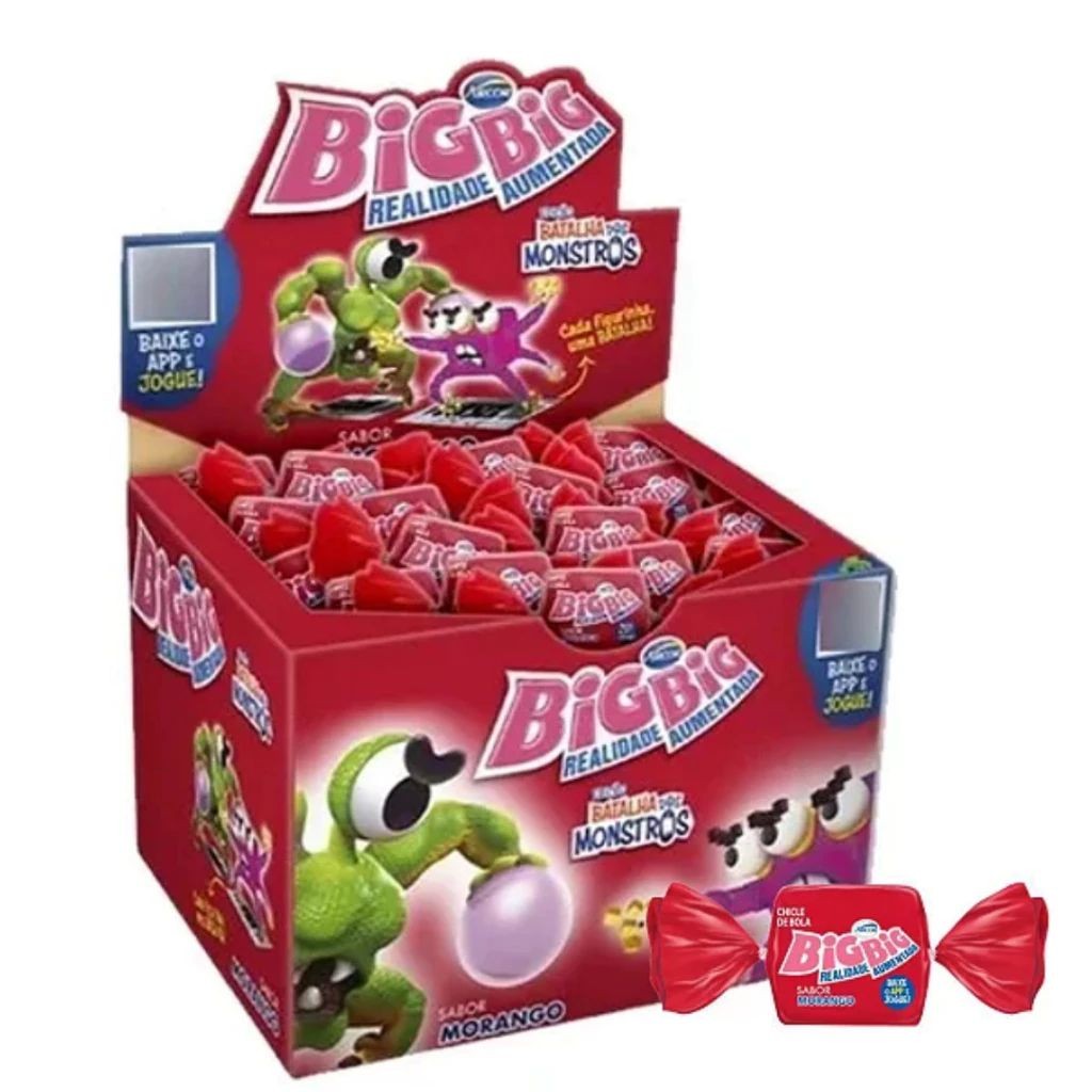 O chicle Big Big tem sabor de morango, baixe o app e jogue! CHICLE DE BOLA, SABOR ARTIFICIAL DE MORANGO, COLORIDO E AROMATIZADO ARTIFICIALMENTE, INGREDIENTES: AÇÚCAR, XAROPE DE GLICOSE, GOMA BASE, ÓLEO VEGETAL DE MILHO, EMULSIFICANTE LECITINA DE SOJA, ACIDULANTE ÁCIDO CÍTRICO, AROMATIZANTE, UMECTANTE: GLICERINA E CORANTE VERMELHO 40 (E129/INS 129). ALÉRGICOS: CONTÉM DERIVADOS DE SOJA. NÃO CONTÉM GLÚTEN. INDÚSTRIA BRASILEIRA.
