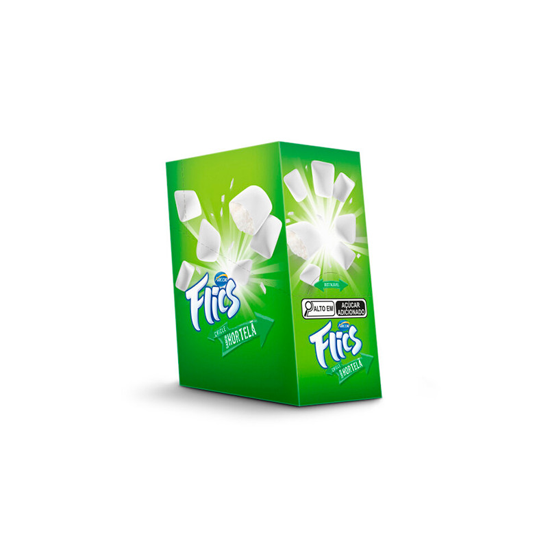 O chicle Flics tem sabor de hortelã, é refrescante e fácil de levar para qualquer lugar. GOMA DE MASCAR, SABOR ARTIFICIAL DE HORTELÃ. AROMATIZADO ARTIFICIALMENTE – INGREDIENTES: AÇÚCAR, GOMA BASE, XAROPE DE GLICOSE, MALTODEXTRINA, AROMATIZANTES, UMECTANTE GLICERINA, EMULSIFICANTE LECITINA DE SOJA, CORANTE DIÓXIDO DE TITÂNIO (INS 171) E GLACEANTE CERA DE CARNAÚBA. ALÉRGICOS: CONTÉM DERIVADOS DE SOJA. NÃO CONTÉM GLÚTEN. INDÚSTRIA BRASILEIRA.