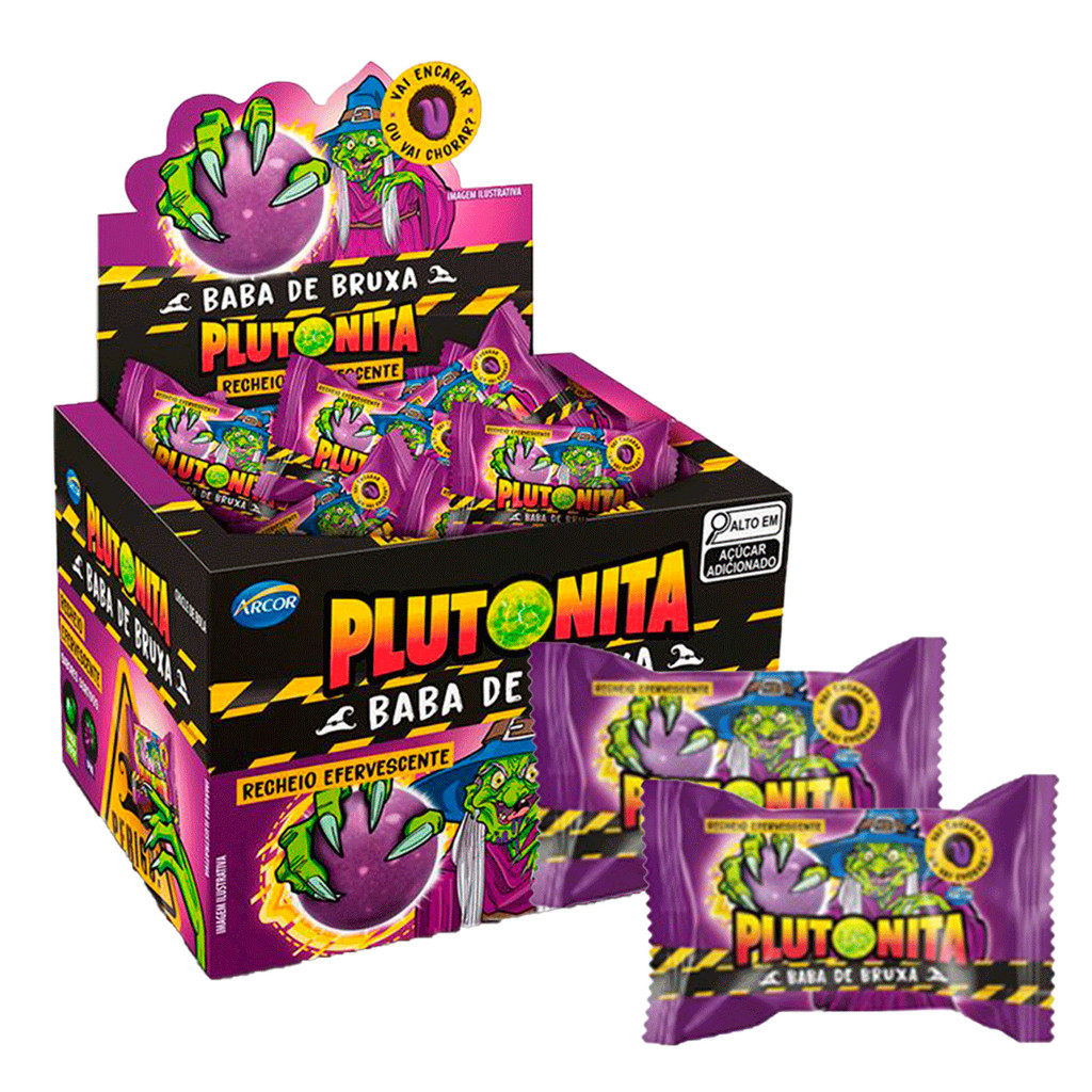 O Chiclete Plutonita Baba de Bruxa possui casquinha crocante, com recheio efervescente nos sabores maçã e uva. Contém 36 unidades. Ingredientes: - Açúcar, goma base, xarope de glicose, óleo vegetal de milho, maltodextrina, acidulante ácido cítrico, regulador de acidez bicarbonato de sódio, antiumectante metassilicato ácido de magnésio, aromatizantes, emulsificante lecitina de soja, umectante glicerina, espessante goma arábica, glaceante cera de carnaúba, corantes naturais: carmim (e120/ins 120) e cúrcuma (e100/ins 100i) e corante artificial azul brilhante (e133/ins 133). Não contém glúten. alérgicos: contém derivados de soja. Informações Nutricionais: Porção de 5g (1 unidade) Valor Energético 16Kcal (1%) Carboidratos 4g (1%) Açúcares 3,4g (0%) Proteínas 0g (0%) Gorduras Totais 0g (0%) Gorduras Saturadas 0g (0%) Fibra Alimentar 0g (0%) Sódio 20mg (0%)