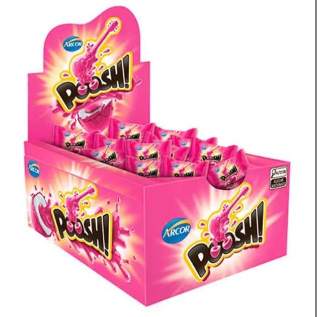 O chicle Poosh! tem casquinha crocante e recheio sabor tutti-frutti. Ingredientes: açúcar, xarope de glicose, goma base, maltodextrina, umectante glicerina, emulsificante lecitina de soja, estabilizante com arábica, corantes: carmim e cúrcuma, glaceante certa de carnaúba e aromatizantes.NÃO CONTÉM GLÚTEN. ALÉRGICOS: CONTÉM DERIVADOS DE SOJA E PODE CONTER LÁTEX NATURAL.