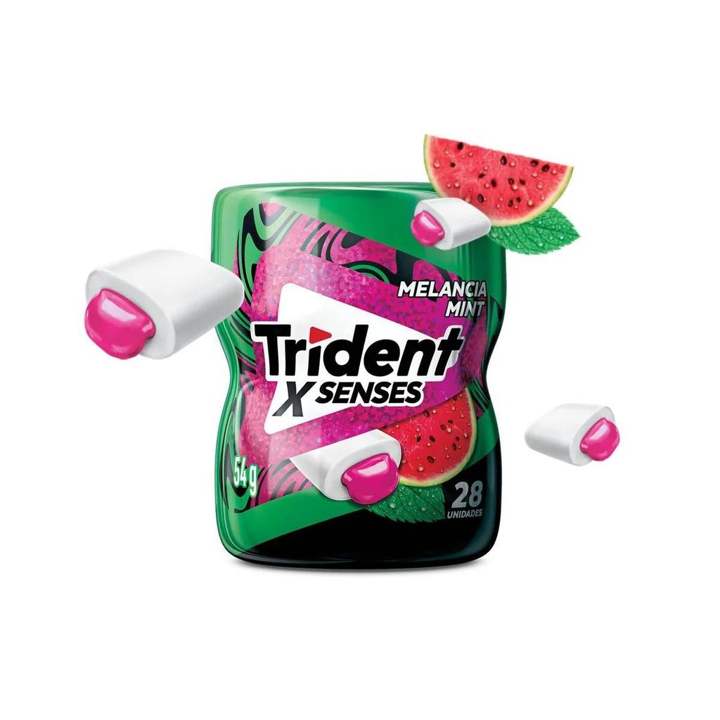 Surpreenda-se na primeira mascada com Trident X Senses. A combinação entre o docinho da melancia e a refrescância da menta vai destravar um novo nível de sabor e sensações na sua boca em uma textura de chiclete que mescla uma casquinha super crocante por fora e um delicioso recheio líquido. O novo Trident X Senses é sem açúcar e conta com 28 unidades que vem em um potinho super prático para levar na mochila, deixar no carro ou dividir com a galera. Masque um Trident e destrave uma nova atitude!Tabela Nutricional e Alergênicos: veja a tabela nutricional e ingredientes nas imagens.