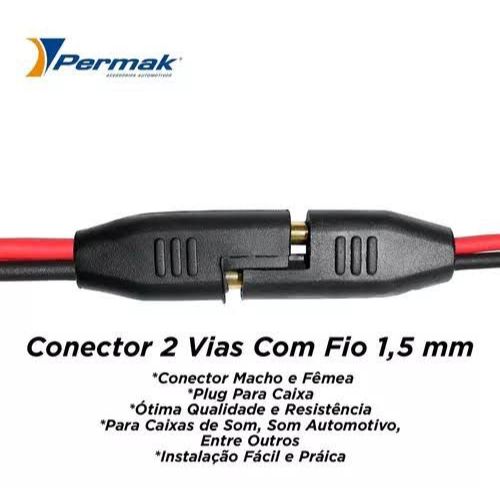 O chicote 2 vias fio 1,5 mm apresenta um comprimento aproximado de 23 cm. Seu fio possui a parte interna de cobre, a capa e o conector são de PVC e os terminais são de latão. O cobre e o latão garantem ótima condução de calor e eletricidade, o PVC proporciona um ótimo isolamento e impede que chamas sejam propagadas. Está disponível na cor preta. O chicote 2 vias fio 1,5 mm tem a função de facilitar a instalação e retirada de caixas de som no automóvel. Por ser universal, este chicote pode ser aplicado em diversos modelos de carros. Especificações técnicas: – Comprimento total aproximado: 23 cm – Material do fio: cobre – Material do cabo: PVC – Material do conector: PVC – Cor: preto Valor Unitario