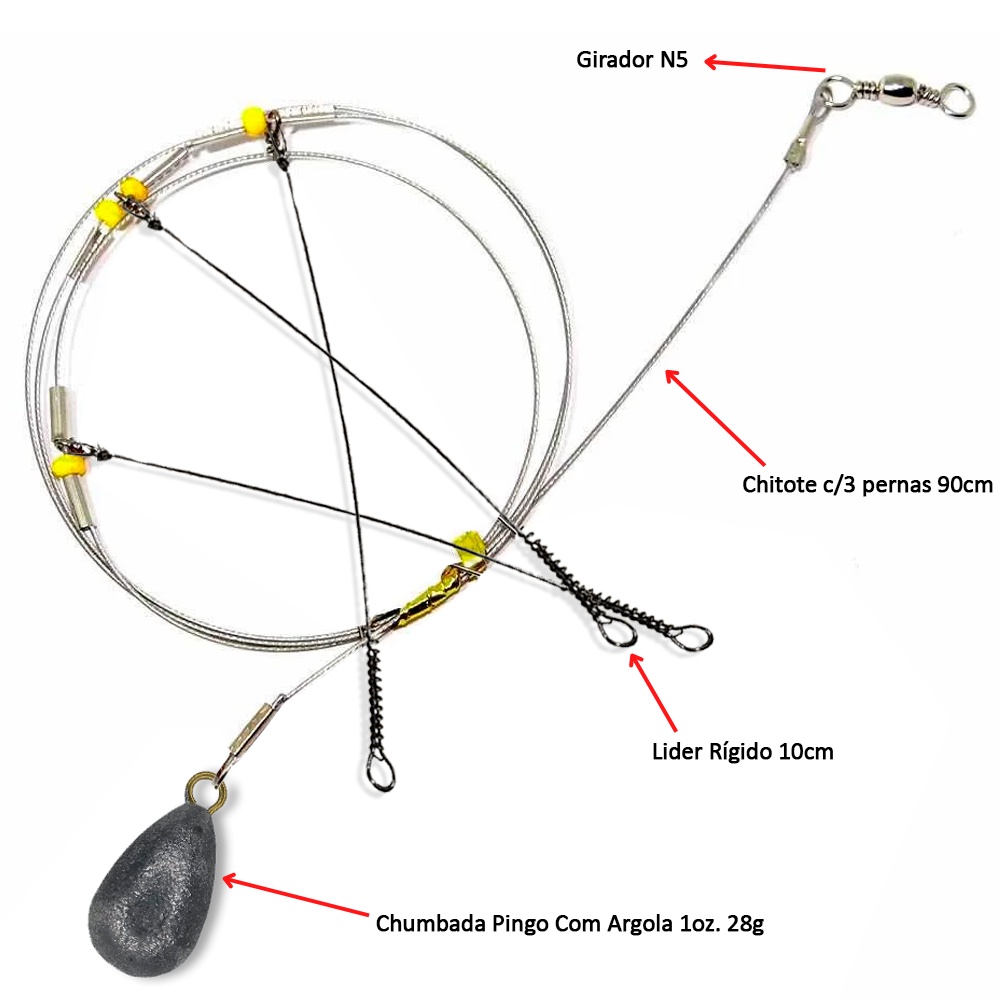 Chicote Pesca Mar Com 3 Pernadas E 1 Chumbada. Chicote de 3 pernadas para pesca de fundo no mar, feito com fio de aço flexível, rotores nas pernadas em aço rígido para a fixação dos anzóis. Sem dúvidas, este acessório não pode ficar de fora da sua pescaria! ESPECIFICAÇÕES: Marca: Summer Modelo: Chicotinho de Pesca 3 Pernadas Tamanho: 90cm Resistência: 40lbs Capacidade P/: 3 Anzóis Chumbo: 1 Chumbada Pingo Com Argola 1oz. 28g Girador: Girador BBS Nickel N5 Imagens Ilustrativas