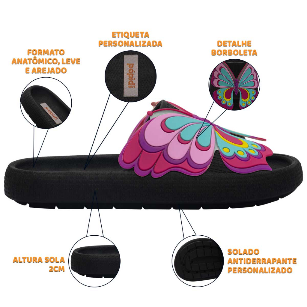 CHINELO NUVEM BORBOLETA Tamanho da Forma: Normal - Recomendamos que compre o tamanho padrão de uso, para melhor calce e maior conforto. Cores Disponíveis: • Rosa • Branco • Marinho • Preto • Verde • Rosa Especificação Técnica: • Tipo de produto: Chinelo Nuvem. • Material externo: PVC. • Material interno: PVC. • Sola: PVC. • Peso médio do produto: 564 gramas. • Altura da sola: 2,0 cm. • Fechamento: Calce Fácil. • Numeração: Será enviada pelo critério de escolha. • Embalagem: Esse produto não é entregue em caixa individual. Tabela de Medidas: 25/26 ---------------- 16,0 cm 27/28 ---------------- 17,5 cm 29/30 ---------------- 19,0 cm 31/32 ---------------- 20,0 cm 33/34 ---------------- 22,0 cm 35/36 ---------------- 23,5 cm 37/38 ---------------- 26,0 cm 39/40 ---------------- 27,0 cm Como Medir: Coloque o pé em cima de uma folha de papel e risque em volta dele com um lápis ou caneta. Meça o comprimento do topo até a base do contorno e adicione 0,5 cm de folga. Limpeza e Conservação: Evite usar substâncias abrasivas como álcool, detergentes ou solventes nos calçados. Nunca os mergulhe na água, os deixe de molho ou lave na máquina. A secagem dos produtos deve ser feita à temperatura ambiente e na sombra, nunca no sol ou em máquinas. Dicas Pópidi: O Chinelo Nuvem Borboleta é perfeito quando se fala em conforto e leveza aos pés, podendo ser a opção perfeita para dias mais frescos, por exemplo. Confeccionado em material emborrachado, super confortável, macio e resistente que proporciona o encaixe perfeito dos pés, já que possui formato anatômico e solado antiderrapante, dando maior aderência em cada passo. Para passeios na cidade, combine o chinelo com roupas leves e confortáveis, e para aquele toque mais estiloso, aposte em opções com tecidos jeans. Sobre a Marca: Conectados com o universo infantil através de produtos que transmitem nossos valores, a Pópidi acompanha o dia a dia da criança com muito respeito, dedicação e atitude, desde o nascimento até a pré-adolescência. Oferecemos proteção, conforto e estilo, buscando sempre inovar a cada lançamento. Cuidando com excelência da relação pré e pós vendas, afinal a satisfação de nossos clientes é muito importante para nós. Atendimento: Segunda à sexta: 07:00 às 18:00 Sábado: 08:00 às 12:00 Boas compras e volte sempre!!!