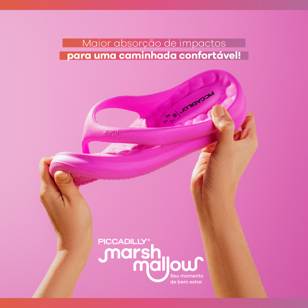 Sua princial função é Absorção de Impacto e Conforto, de tal modo muito indicado para quem sofre de dores nos pés causadas por Esporão, facite plantar, entre outras patologias. Calçar conforto nunca foi tão gostoso. A Sandália Marshmallow é assim como o doce: ultraleve e muito flexível. Perfeito para deixar sua rotina mais descomplicada. Eles podem ser usados dentro ou fora de casa, seja nos momentos de descanso, no home office ou naquelas saidinhas essenciais. É só calçar e pronto: você tem um produto delicioso nos pés. são fáceis de usar e limpar. Basta ter água em temperatura ambiente, detergente neutro e uma escovinha. Outro diferencial é o solado antiderrapante, pensado para que as pessoas não escorreguem e fiquem seguras a cada passo. Os calçados são produzidos em EVA, um material 100% reciclável, que tem maciez e alta durabilidade. Isso reforça o olhar atento da PICCADILLY para o meio ambiente; uma preocupação que vem há muitos anos. Ele vai deixar seu dia a dia mais saboroso. Combine com outras roupas confortáveis como shorts, vestidos, macacões e calças de moletom. Original com Garantia de Fábrica