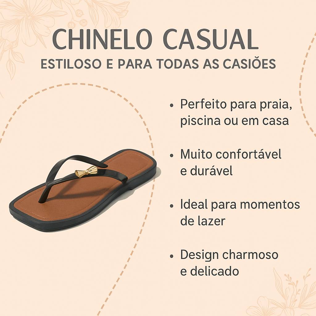 Chinelo Feminino com Laço Dourado na Correia – Conforto e Delicadeza em Cada Passo Esse chinelo feminino foi pensado para quem busca conforto no dia a dia sem abrir mão de um toque delicado e elegante. O grande destaque fica por conta do laço dourado aplicado na correia, trazendo um charme especial que combina tanto com looks casuais quanto com produções mais arrumadinhas. Destaques do Produto Design delicado e feminino com laço dourado na correia Conforto para o dia a dia, ideal para uso prolongado Calce fácil, prático para rotinas corridas Solado leve e macio, que ajuda a reduzir o impacto ao caminhar Versátil, combina com shorts, vestidos, saias e calças leves Perfeito para casa, passeio, praia, viagem e uso casual Descrição Detalhada O chinelo possui correia macia que envolve o peito do pé com conforto, evitando apertos e atritos. O laço dourado na correia é o ponto de destaque do modelo, trazendo um visual moderno e sofisticado, perfeito para quem gosta de detalhes diferenciados. O solado é desenvolvido em material leve e resistente, oferecendo boa aderência ao chão e maior segurança ao caminhar. A palmilha foi pensada para proporcionar sensação de maciez, acompanhando o formato do pé e tornando o uso mais agradável ao longo do dia. Perfeito para quem quer um chinelo bonito e confortável para usar em casa, no condomínio, em viagens, no fim de semana ou até para compor looks mais despojados para sair. Ficha Técnica Modelo: Chinelo feminino com laço dourado na correia Detalhe: Laço decorativo dourado aplicado na correia Palmilha: Macia, com toque confortável Solado: Leve, resistente e com boa aderência Indicado para: Uso diário, passeio, casa, viagem, momentos de lazer Estilo: Casual, delicado e feminino Tabela de Medidas (Medidas aproximadas da palmilha para ajudar na escolha do tamanho ideal) Tamanho (BR)Comprimento da palmilha (cm)Largura aproximada (cm)3422,5 cm8,5 cm3523,0 cm8,7 cm3623,5 cm8,9 cm3724,0 cm9,1 cm3824,5 cm9,3 cm3925,0 cm9,5 cm Como medir o pé (dica para o cliente): Coloque o pé em uma folha de papel encostada na parede. Marque do calcanhar até a ponta do dedo maior. Meça com uma régua e compare com a tabela. Se estiver entre dois tamanhos, recomendamos optar pelo maior para maior conforto.